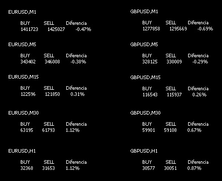 bueno, como puede que el primer post sea dificil de entender para más de uno, os dejo otra imagen estadistica que espero aclare de qué estoy hablando como podeis ver en la imagen solo he colocado los pares EURUSD y GBPUSD pero simplemente a modo de ejemplo, esto se cumple para todos los pares la columna de BUY son las barras que han acabado positivas, es decir, las que han cerrado por encima de su apertura y la columna SELL al reves, las que han cerrado por debajo de su apertura Como podeis ver la diferencia en porcentaje es realmente pequeña aunque el par se haya movido miles de pips en una u otra dirección al final tiende a equilibrarse y registrar el mismo numero de barras positivas que negativas. evidentemente no es un porcentaje exacto del 50% de unas y otras barras sino que varía ligeramente el objetivo de lo que planteo es aprovechar esas diferencias extremas. sabiendo que el par tiende a fluctuar y buscar el equilibrio, lo que estoy tratando de hacer es entrar al mercado cuando hay una diferencia en porcentaje significativa. haciendo un backtest visual he visto que mas o menos es alrededor del 15% de diferencia en graficos de 5 minutos cuando el par busca un equilibrio entre las barras positivas y negativas bueno, espero que esto aclare un poco mi explicación inicial un saludo