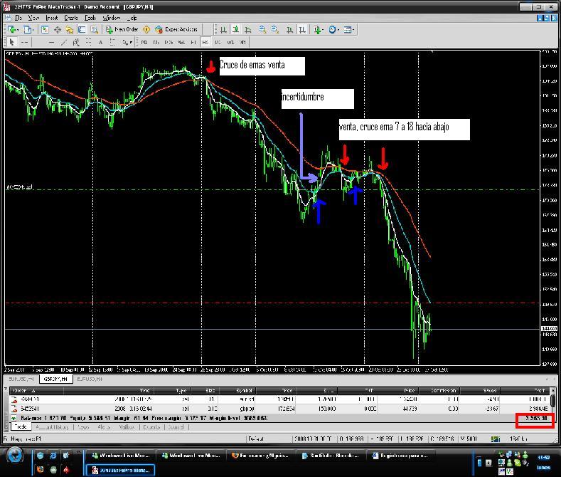 - Esta es la grafica con las posiciones que tengo en EUR/USD y GBP/JPY, muevo el stop loss manualmente un poco más arriba de la ultima resistencia. voy en 3990 con lotes de 0.1 por el manejo de riesgo.