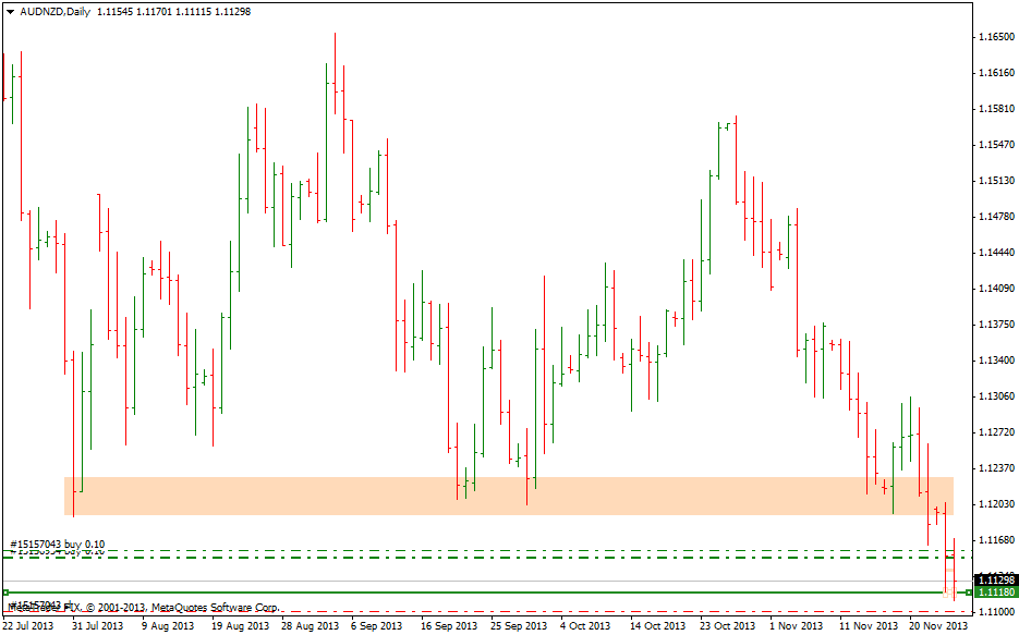 En el trade del AUDNZD el precio no se ha movido con la intensidad que esperaba( a pesar de los datos de las dos ultimas mediasnoches) y ha llegado a  una zona de resistencia( hace unos días soporte mensual) importante, aunque si bien es cierto no ha tardado mucho en volver a testearla.  He cerrado dos posiciones  con algo de beneficio y dejo una abierta con stop en Even.