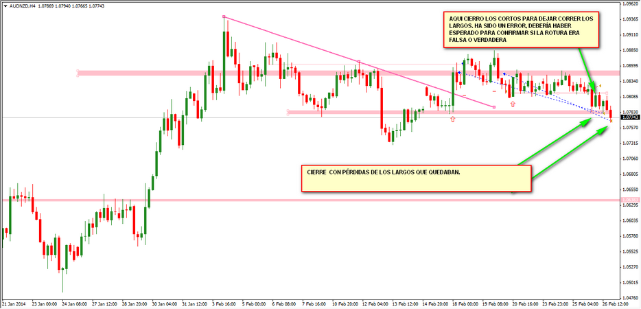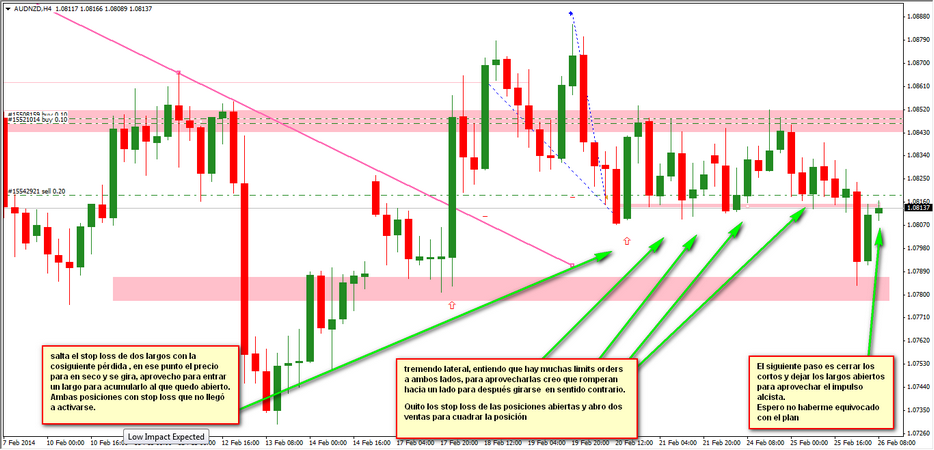 buenos días, No te falta razón FXW pero la verdad es que lo de construir un sintético me cuesta más verlo y controlarlo, sobre todo con varias operaciones abiertas a distintos precios. Dejo un actualización del trade del AUDNZD, la verdad es que he pensado cerrar manualmente las posiciones que quedaban abiertas ya que no me gusta cuando el precio pierde el impulso inicial y comienza a moverse en rango. Ese no era mi trading plan inicial. En fin trade complicado, esperemoS que la rotura hacia abajo sea para absorber órdenes. Dejo las explicaciones en el gráfico, espero que se entienda más o menos. saludos.
