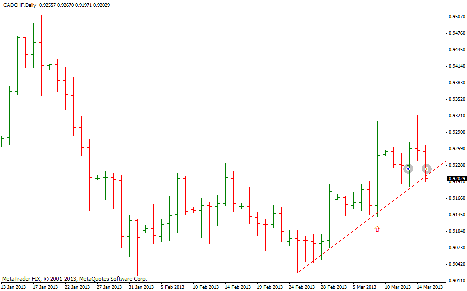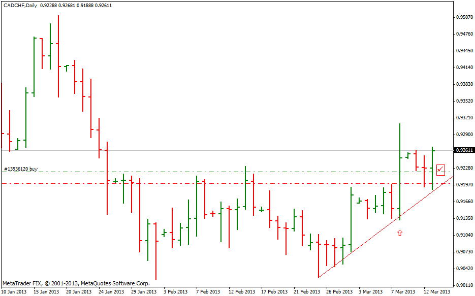 eurusd en velas 1d, salto el stop de 20 puntoss. Viendo el comportamiento esta mañana ,he abierto largo sacando algunos puntos. El gráfico es de 4h para que se vea mejor. cadchf en velas 1d, el mercado se ha girado y al saltado el stop en even. Quizás se pueda busca otra oportunidad en este par. saludos