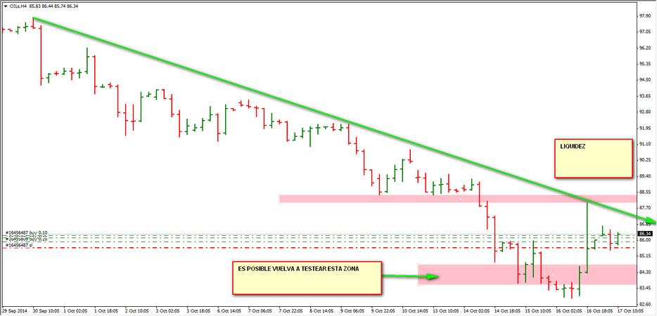 Les dejo este trade de hace un momento en el oils, hemos llegado a zona de soporte/resistencia, zona que no tocaba desde hace mucho tiempo. Trade difícil pues la presión bajista es enorme. Dejo el stop bastante ajustado por si hay que volver a entrar más abajo pues no descarto que haya algún testeo más ...o incluso que me quivoque y se vaya mucho más al sur. De momento la haré un seguimiento por si cierro en manual. saludos