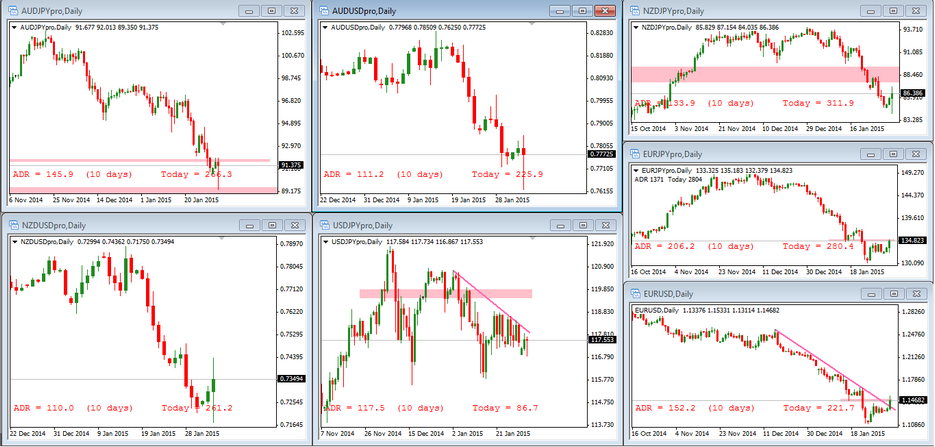 Después de los acontecimientos del día 15 de enero se presentan muchas e interesantes oportunidades de trading. El volumen negociado ese día fue brutal. Hoy he marcado en todos mis gráficos ese día, tando verticalmente como con una línea horizontal en el máximo del día y el mínimo. La situación es ideal para operar breakouts o mejor esperar a un pullback a esas líneas que he comentado . En los gráficos he visto varias situaciones: La vela del día 16 es una inside bar, pues bueno se podría operar su breakout o bien esperar a que sobrepase la vela madre( que sería la anterior, es decir la del famoso día 15. Por ejemplo en el GBPNZD. Par que llevo persiguiendo para sacarle miles de pips. La vela del día 16 perforó a la del día 15 y volvió a cerrar dentro de ella, por ejemplo en el USDCAD que nos ha dejado un pequeño martillo. Aqui mi campo de batalla sería el máx/min de ese martillo. Con un adecuado MM creo que podemos sacar provecho de esa situación del día 15. Luego por otro lado tenemos las acciones suizas. Si yo fuera el banco de españa¿ no iba a avisar al Santander, BBVA, Caixabank de lo que se avecinaba? Creo que los grandes bancos suizos han sido los grandes ganadores de esta situación. Por lo que dentro de la bolsa suiza, los bancos serían mi primera opción y luego farmaceúticas. La bajada de la bolsa suiza creo que es una oportunidad para compra.Dejo el gráfico para que lo veáis, con las posibilidades que manejo de momento. saludos