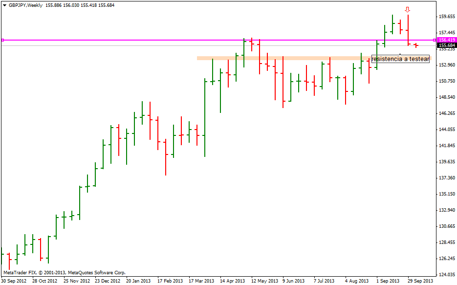 Buenas Irka, Respecto al EURUSD ,como tu bien has comentado, ten cuidado pues has vendido justo en la zona/area de resistencia.Una ayuda sería ver que rompe con claridad la trendline dibujada . En cualquier caso en esto del trading, todo es posible. Y cualquier análisis es bueno, luego el precio decidirá. En GBPJPY te dejo el gráfico semanal, quizás antes de tirar para arriba testea la zona de resistencia.Pero tenemos también posible reverse y divergencia en el MACD. En cualquier caso tu sigue con tu trading plan porque esto es sólo mi visión . Si sacas cosas de mis gráficos que te sirvan a mejorar, para mi será una satisfacción poder ayudar y aportar algo. Estos gráficos te lo pongo en otro post. Hay una manera de encontrar buenos trades, realmente buenos....en vez de buscar motivos para entrar....es buscar motivos para no entrar en la operación. Si no encuentras ningún motivo para no entrar...entonces es un buen trade. Mira por ejemplo el MARTILLO en gráfico semanal que dejó en agosto del 2011. Desde mi punto de vista fue perfecto, no encuentro ningún motivo para no entrar largo en su día. buen trading