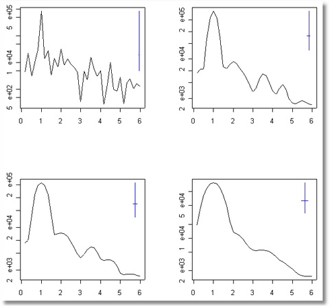 Muchas gracias por leerme, daykoku. Mientras buscaba información a cerca de esta "visión" de los mercados, un amigo me pasó un enlace de un documental que hizo la 2 en España sobre el trading algoritmico. Una de las cosas que más me llamó la atención es que, de entre los que se dejaron filmar algo, los de Knight Capital no tenían en ninguna pantalla ni un solo gráfico. Tan solo líneas de código. Se parecía más a Matrix que a cualquier plataforma habitual  . Así que, si sabemos que la mayoría de las operaciones que se comercian se hacen a través de estos sistemas, quizá solo quizá, "mirar velas" no sea lo más adecuado. Son adictivas, coloridas, fascinantes, están vivas, "creemos ver" patrones repetitivos sobre los que hacer nuestra operaciones y nos olvidamos de las matemáticas que hay detrás (y delante, a la izquierda y a la derecha, jejeje). Voy a seguir donde lo dejé ayer deseando que alguien más se "contagie" con estas ideas  . Análisis del espectro de frecuenciasSe demuestra que cualquier proceso periódico se puede modelar, con la precisión deseada, mediante series de términos de funciones senoidales (seno y coseno), lo que se conoce como series de Fourier, y se denomina espectro a la representación de las amplitudes, en el eje de las Y, que constituyen los diferentes términos de la serie para toda la gama de frecuencias (eje de las X). El espectro es una herramienta fundamental para detectar estacionalidad en una serie y determinar su periodo. Como es de esperar, el espectro está íntimamente relacionado con la función de autocorrelación. En la siguiente figura se muestra una imagen típica del espectro de frecuencias de una serie, en el que se representa en el eje de las Y la amplitud y en el de las X la frecuencia, y partiendo de la estimación directa del espectro a partir de los datos (esquina superior izquierda), se va refinando mediante procedimientos de alisado y nos permite en este caso detectar la presencia de un factor de periodicidad para la frecuencia en torno del valor 1. Puesto que Periodo = 1/ Frecuencia, obtenida la frecuencia, o frecuencias (picos en el espectro), a partir de ésta se calcula de forma sencilla el periodo de las oscilaciones en la serie de datos. Los datos no tienen significado por sí mismos, sino en relación a un modelo conceptual del fenómeno que los produce. Las manzanas venían cayéndose de los árboles mucho antes de que Newton estableciese las ecuaciones del movimiento de caída libre de los cuerpos; la circulación de la sangre se comportaba de igual forma antes y después de Harvey; las estrellas y planetas se movían en el espacio de igual manera en los tiempos de Ptolomeo, de Galileo, de Copérnico, de Kepler, del mismo Newton, o de Einstein. Los datos relativos al movimiento de los planetas recogidos en las diferentes épocas, salvo por diferencias en la capacidad de la instrumentación existente en el momento, eran similares; lo que fue evolucionando a lo largo del tiempo es el modelo conceptual establecido por cada científico para explicar el fenómeno. Aunque en la historia de la ciencia, desde un punto de vista formal, durante mucho tiempo solo existieron modelos de tipo determinista, en los que el fenómeno se expresaba mediante leyes matemáticas perfectamente formuladas, de tal manera que conocidas las variables que intervenían en el modelo y su valor, el resultado quedaba completamente determinado, y solo más recientemente se empezó a plantear modelos de tipo probabilístico, en los que conocidas las variables únicamente se calculaba la probabilidad de aparición de un resultado, y en los que se introducía por tanto un margen de incertidumbre, realmente este tipo de modelos probabilísticos ha venido siendo utilizado desde siempre, sin una formulación matemática expresa, por el ser humano, quién en su toma de decisiones se ha basado en la estimación de la probabilidad de que algo ocurra en base a lo que ha observado que ocurrió con anterioridad en situaciones similares, aunque lo que a veces nos dicta lo que conocemos como "sentido común" se ha revelado en muchas ocasiones como contrario a la realidad científica. La construcción de modelos de riesgo de aparición de un suceso es de gran importancia en cualquier rama que queramos estudiar (en este caso, el trading), tanto para intentar conocer las variables que influyen en que se presente ese suceso, como para analizar el mecanismo que lo produce y para predecir su aparición. En el primer caso, el conocimiento de las variables que influyen nos permitirá establecer medidas (cuando entrar al mercado?), y en el segundo mediante el modelo podemos efectuar cálculos relacionados con la aparición del suceso, por ejemplo para determinar TP ó SL. Precisamente la teoría matemática para el cálculo de modelos de riesgo tiene su origen probablemente en este último aspecto, y más concretamente en el campo de la ingeniería, donde la demanda creciente de equipos que funcionen cada vez mejor y a un menor coste lleva aparejada la necesidad de disminuir las probabilidades de fallo de éstos, lo que posibilitó el estudio y desarrollo de modelos probabilísticos para analizar la naturaleza de esos fallos y minimizar así la probabilidad de que ocurran, lo que en ingeniería se conoce como teoría de la fiabilidad (reliability) y en medicina habitualmente como análisis de supervivencia (survival analysis). Cualquier construcción matemática, por sencilla que ésta sea, constituye un modelo y como tal una simplificación de la realidad, útil pero simplificación al fin y al cabo. Así en términos de supervivencia es habitual utilizar la mediana como dato resumen. La mediana es el valor que deja el 50% de los datos a cada lado de la distribución. A diferencia de los modelos deterministas propios de las leyes físicas, los modelos que se pueden/deben pensar para el trading, son en su gran mayoría modelos probabilísticos, sujetos a incerti