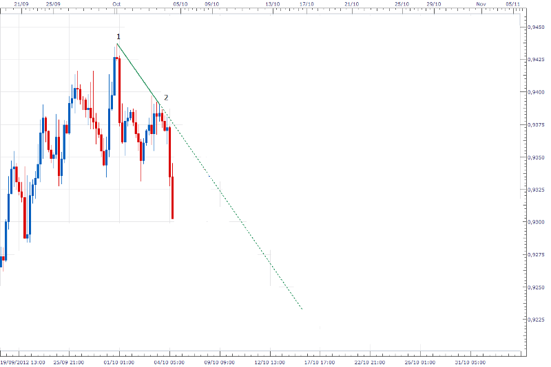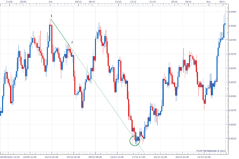 Re: APRENDE Analisis Tecnico de Forma SencillaLo que les recomiendo es que cuando unan dos picos o dos bajos hacerlo con una linea entre cortada, para definir bien que esa linea no es una linea de tendencia sino un proyecto de la misma. Al ver la linea de esa forma mentalmente estan menos predispuestos a vender cuando el mercado llegue a topar la linea nuevamente. Aqui pueden ver como la union de 1 y 2 no fue una linea de tendencia y el mercado se movio al alza, pero dense cuenta como la linea entre cortada fue alcanzada por el mercado y rebotando, convirtiendo recien en linea de tendencia.