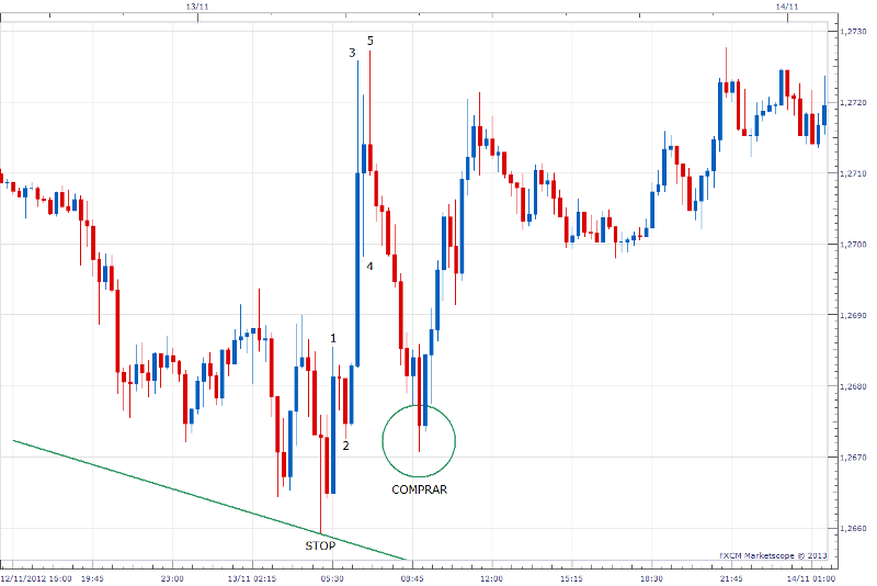 2. Confirmar si el rebote de la linea de tendencia es bueno o la va a romper, y la mejor forma es aplicando el patron de ondas de elliott en periodos de tiempo cortos por ejemplo 15 o 5 minutos. Por ejemplo veamos la segunda compra de la linea de tendencia bajista en 15 minutos. Miremos que la estructura del rebote y vemos claramente 5 ondas de elliott lo que forman un impulso, lo que nos da una buen perspectiva para entrar, por lo que, esperamos el retroceso y entramos en compra con el stop por debajo del punto de rebote. tw: @lcparodi - skype: lcparodi