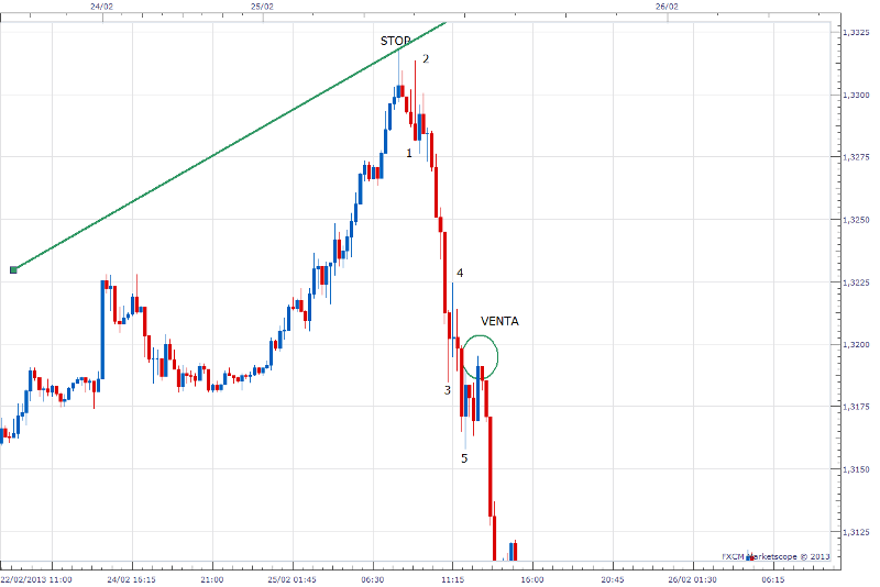 Re: APRENDE Analisis Tecnico de Forma SencillaVeamos otro ejemplo la venta del ejemplo de linea de tendencia alcista. Aqui podemos verlas 5 ondas de elliott pero el retroceso estan corto, que no nos hubiera dado tiempo de entrar en venta. Este tipo de retrocesos se dan cuando los movimientos del mercado son violentos. Pero en todo caso esa era la manera correcta de hacer el trade.