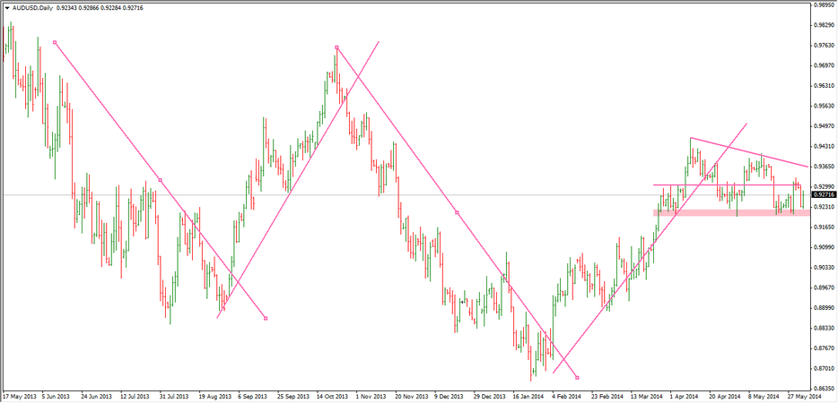 El par en cuestión se encuentra en un amplio rango de consolidación lateral desde principios de abril, quizás una opción sería esperar a ver por donde rompe. Para los que hagan swing merece la pena echarle un vistazo al último statement del banco central de australia de fecha hoy: http://www.rba.gov.au/media-releases/2014/mr-14-10.html "El descenso más temprano en el tipo de cambio está ayudando a lograr un crecimiento equilibrado de la economía, pero en menor medida que en el pasado, como resultado de los niveles más altos de los últimos meses. El tipo de cambio sigue siendo alto en términos históricos, en particular dada la mayor caída en los precios de las materias primas." "The earlier decline in the exchange rate is assisting in achieving balanced growth in the economy, but less so than previously as a result of the higher levels over the past few months. The exchange rate remains high by historical standards, particularly given the further decline in commodity prices." saludos
