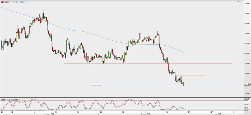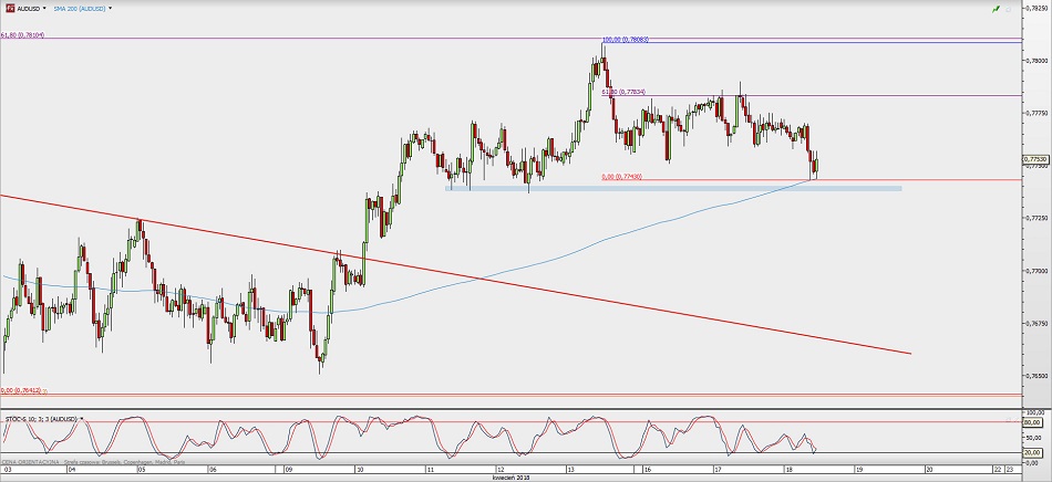 AUD/USD: prueba el soporteEl AUD/USD defiende un promedio móvil de 200 periodos en 0.7745, el lado alcista claramente no quiere permitir una activación bajista. Puede resultar en un aumento a 0.7785, donde está el retroceso de Fibonacci del 61.8%, correspondiente a los niveles del 17 de abril. La perforación del soporte, será el avance hacia 0.7735, mínimos del 11 y 12 de abril.
