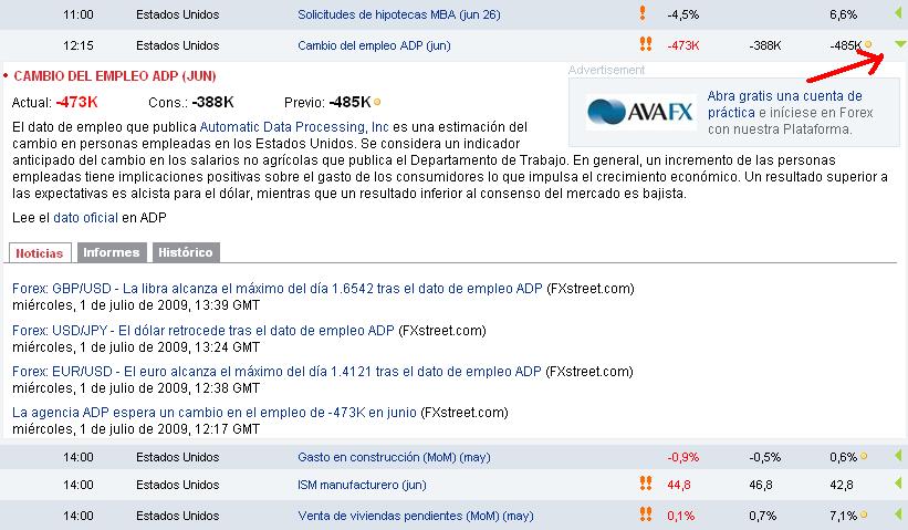 1. Ups!! que pena lebanen, no te contesté la última duda, esos datos quedan en negro porque efectivamente son igual al valor esperado. Aquí en los fundamentales todo es custión de percepción, de como "el pueblo" (ya me gustó esta palabra) percibe la noticia, si el valor está muy alejado de lo esperado, el dato se asimila como muy positivo o muy negativo según sea el caso y en consecuencia así se espera sea el movimiento del precio. Por eso vas a ver casos en los que, a pesar de que el dato es negativo, no es tan malo como se esperaban y eso es lo que genera optimismo en el pueblo. Eso es precisamente lo que inicio el rally de la Bolsa en USA por ahí de Marzo, muchos indicadores comenzar a mostrar desaceleración en la caída y esto se entendía como bueno, porque no salían tan malos como se esperaba. Esto se presta para que muchos analistas de farándula digan que en realidad la crisis no ha pasado porque lo datos no son buenos en realidad, sino "menos malos". 2. Ok, me doy cuenta de los por menores de las noticias porque si te fijas en la página de fxstreet hay un triángulo al lado derecho del renglón, el que he marcado con una flecha roja: (dale click para agrandar) Ese triángulo te despliega la información de ese fundamental, que significa, quien lo emite, etc. Y tienes pestañas donde puedes ver el gráfico histórico o links hacia las fuentes (viste ya se subir imágines  gracias de nuevo). Así que ya ves que no tengo ningún secreto, todo está ahi mismo en el calendario.