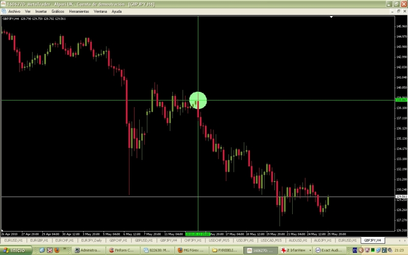 No se muy bien a que te refieres con lo de poner la posición. Desconozco como se hace en estos casos. Disculpa mi torpeza. Como he comentado la operación fué abierta el dia 13 de mayo, a las 9:47 hora española, en el par GBP/JPY en BUY y el precio ha ido muy a la baja. La posición se abre en 138.867 y en este mismo momento está en 129.525. Adjunto captura en TF 4h. para que veas el panorama. El círculo y el la cruz verde señala el punto de entrada. No se si esto te sirve. En cualquier caso si tengo que poner algo más si lo especificas lo pongo de inmediato. Gracias de nuevo vinix por tu disposición. Saludos. Un único objetivo: