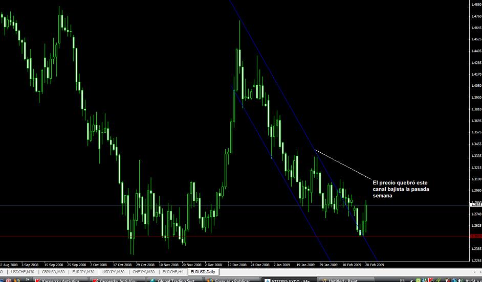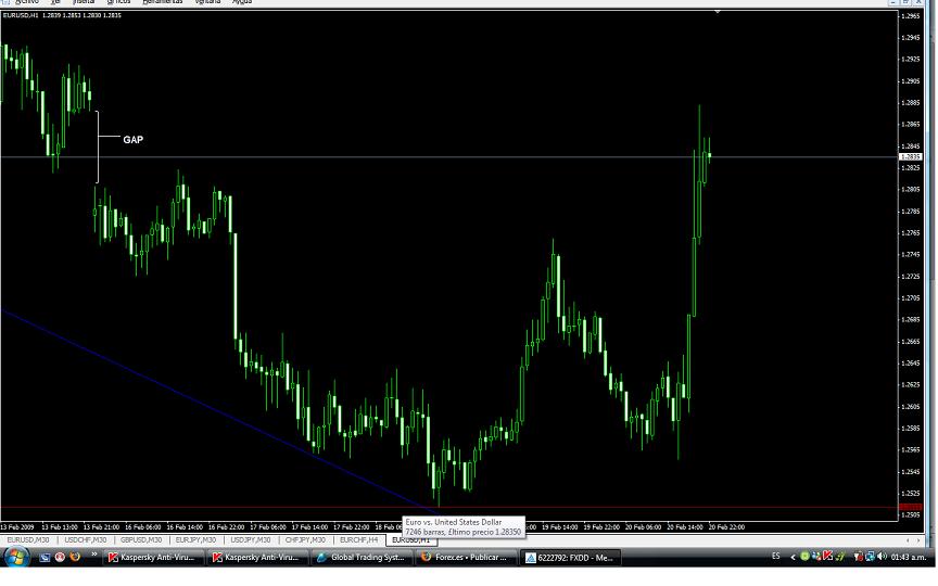 Por otro lado volviendo al tema del EUR/USD el precio con el que cerró el mercado está alrededor de los 1.2832 puntos, es decir que el euro recuperó casi 300 pips el la última jornada, supongo que esto se debe principalmente a la decisión de nacionalizar los bancos estadounidenses, ya que si analizamos al dólar con relación al yen, franco suizo y libra esterlina de igual forma podremos apreciar que este se depreció considerablemente en la última jornada ante todos sus rivales. Parece ser que el mercado ya asimiló el sentimiento positivo generado por el plan Obama y nuevamente el dólar tendrá que hacer méritos reales por sí mismo para seguir siendo considerada la moneda "refugio". Si analizamos el gráfico de 1 hora o de 4 horas podremos observar que el día domingo el mercado abrió con un Gap de aproximadamente 100 pips hacia abajo para luego llegar a un mínimo semanal de 1.2513 puntos sumando como 270 pips mas, es decir al rededor de 370 pips en total, sin embargo el Euro emprendió un duro camino al recuperar todos estos pips para cubrir dicho Gap por completo cerrando en la última jornada de la semana con tan solo 50 pips por debajo del precio de cierre de la semana anterior (Precio de cierre de la semana anterior = 1.2888 Precio de cierre de esta semana = 1.2835). Por tanto dado que este Gap fue cubierto por completo podemos deducir que nuevamente se agotó la tendencia alcista para el dólar al menos en gráficos de 1 y 4 horas (Aunque los gaps son más fidedignos en gráficos a partir de 1 Día hasta 1 Mes), de igual forma lo ideal para el Euro habría sido que el precio en el cierre de la semana se hubiese situado por encima del Gap, aunque el hecho de que el precio haya llegado a cubrir el gap en el trascurso de la última jornada denota debilidad para el dólar. Por último si analizamos gráficos de 1 Día podremos observar que la semana pasada el mercado ya había cerrado rompiendo un canal bajista y esto podría traducirse cómo una posible señal alcista para el Euro, sin embargo este movimiento alcista debería confirmarse en las próximas semanas y no así de forma tan inmediata. Bueno, adjunto los gráficos para comprender mejor el análisis, ya se me pegan las pestañas del sueño, estoy ansioso porque el mercado abra nuevamente el Domingo para observar los primeros movimientos en la sesión asiática venidera y poder compartir nuevas opiniones con el resto del foro Saludos a todos y buen fin de semana