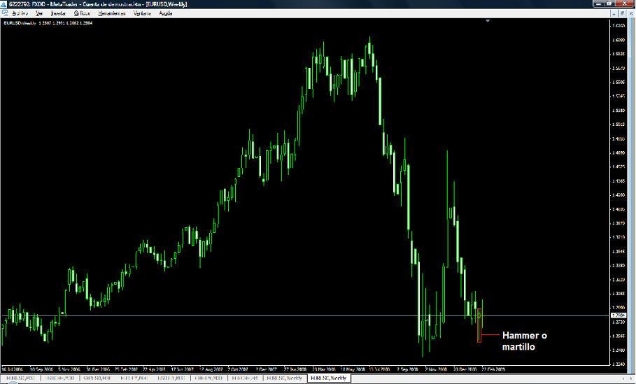 Estuve de viaje el fin de semana, por lo que estuve extrañando mucho sentarme frente al monitor y poder analizar el mercado y compartir con el foro opiniones acerca del par, sin embargo gracias a la tecnología pude estar al tanto de los precios en todo momento mediante mi celular xD jeje, como sea ya que estoy de vuelta... Pues te comento que analizando el par en gráficos de 4 horas de alguna forma se continúa aprenciando una tendencia bajista como tú dices(escribes), sin embargo también se logra contemplar a dicha tendencia algo desgastada, es más pienso que dicha tendencia ya cesó (aunque tal vez sea demasiado atrevido escribir esto). Sea como sea la situación, sabemos como operadores que no es muy recomendable tratar de adivinar cambios de tendencia pues a veces es simplemente imposible, de hecho debemos unirnos a la tencencia predominante: "La tendencia es tu amiga, síguela" aunque en este par ya no se sabe con exactitud cual es la tendencia. Si analizamos el comportamiento del par desde la apertura de esta semana, podremos observar que el día domingo el Euro en la sesión asiática comenzó una rápida subida que concluyó el día lunes con una fuerte toma de ganancias logrando el máximo de esta y la semana precedente situando el precio en 1.2991 para luego caer hasta 1.2659 y al día de hoy situarse alrededor de los 1.2800 puntos Según Nicolle Elliott, Analista Técnico Senior en Mizuho Corporate Bank (Que comentó una análisis el día de hoy en fxstreet.es) opina que existen señales que posiblemente sucitarían un final a la tendencia bajista ya que técnicamente nos comenta que el precio en gráficos semanales nos arrojó un hammer o martillo (como se aprecia en la imágen adjunta). Sin embargo considero que esta formación de velas semanal debería arrojar unas cuantas que sean positivas confirmando así el hammer ya que de lo contrario esta vela (hammer) no sería más que una simple vela en la continuación de una tendencia bajista, desde luego que esto deberemos confirmarlo en las semanas precedentes. Bueno comunidad, me voy a descansar y a poner en orden las maletas :S comenzaré un nuevo hilo en el foro pues este de "Baja inesperada EUR/USD" ya se quedó corto, nos encontramos nuevamente al finalizar la sesión de hoy día o al comenzar la mañana (según los horarios de cada quién). Saludos