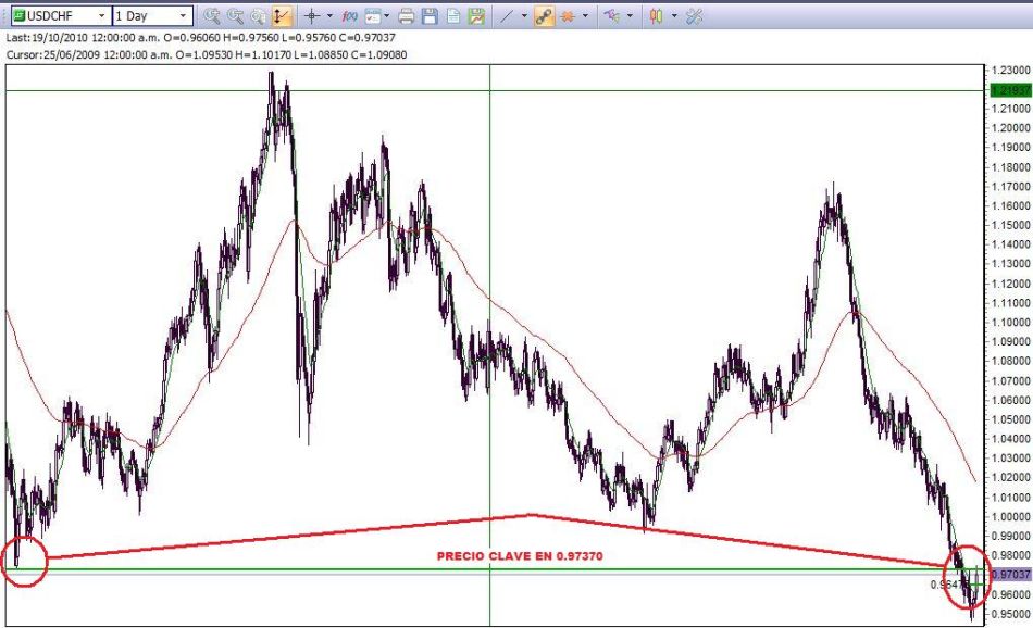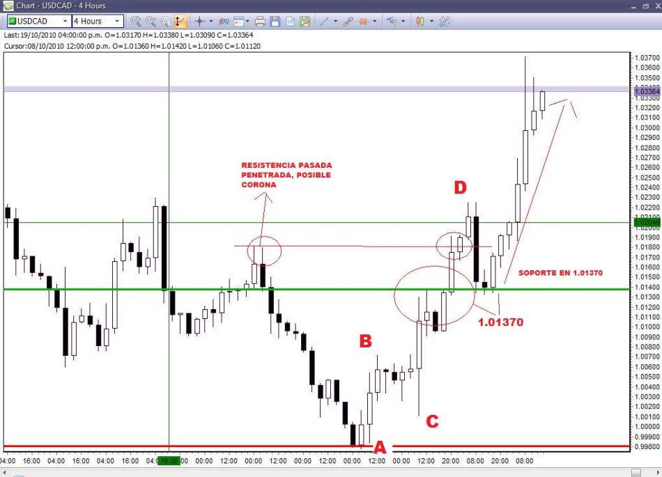 El día 14 de octubre hizo un bajo con el precio mínimo 0.99780. Este bajo se formó tocando un soporte/piso donde las velas de los días anteriores: 07-abr-10 con 0.99760, 22-abr-10 con 0.99590, 23-abr-10 con 0.99670, 26-abr-10 con 0.99690 también rebotaron en este piso apreciando así al dolar por mas de 860 pis en los siguientes 25 días (si se van más para atrás, también fue piso para precios en los meses de julio y mayo del 2008 donde el mercado no los penetró y se fue largo. Sacando el promedio de los 4 precios, considere el precio 0.99800 como Soporte. ingresé un día antes, una entry buy en 0.99850 ( + 5 pips por encima del soporte ya que por el spread podría no abrir mi orden) con una stop loss en 0.98850 (100 pips) y un take profit en 1.01300 (145 pips), el 15 de octubre, la vela del día alcanza su máximo en 1.01370, de modo que me alcanzo para cerrar la orden con 145 pips de ganancia y para pagarle al broker sus casi 5 pips de comisión. jejeje.