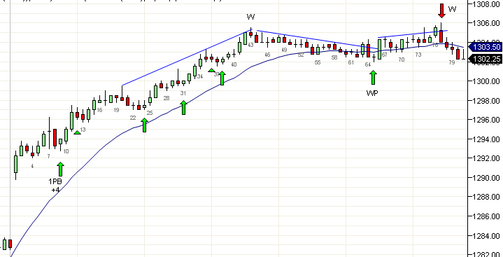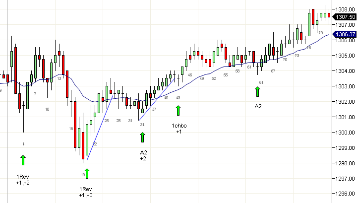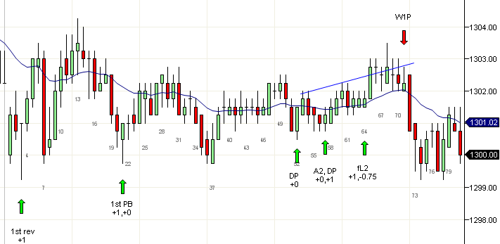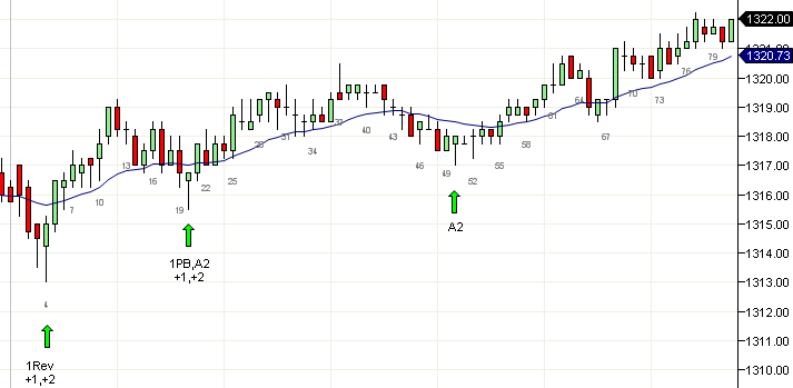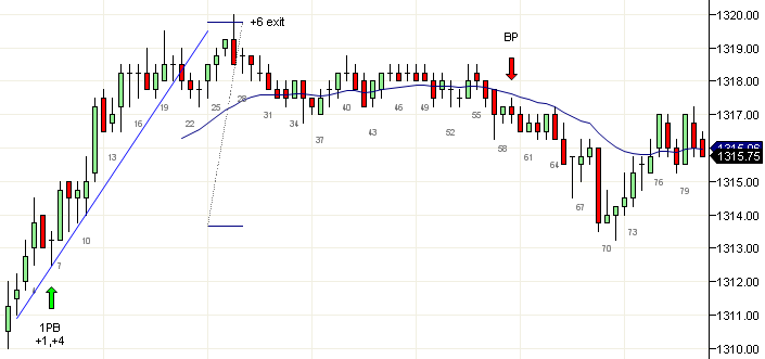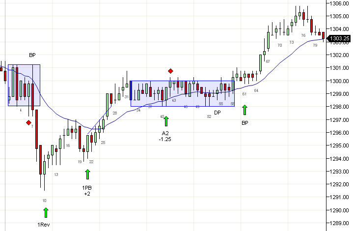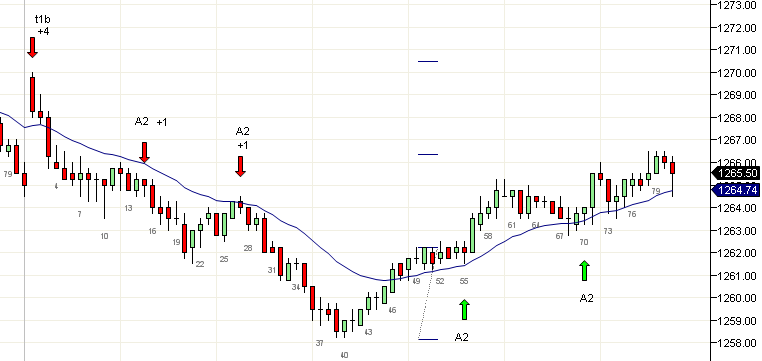 Tendencia desde la primera vela Una excelente vela de tendencia como la primera vela de la sesión no debe dejarse pasar, ya que es probable que avance considerablemente. Una primera vela ideal es de cerca de 2 puntos de tamaño con sombras de no más de 1 tick en sus extremos. Una vela de 3 o más puntos puede actuar como un rango de trading provocando demanda por comprar debajo y vender por encima de ella. Si es un par de ticks más pequeña y la siguiente vela puede dar la entrada y enseguida hacer reversa al movimiento antes de lograr un objetivo de scalp, por tanto, estableciendo un rango de trading. Una manera de asegurarte que entras correctamente es esperar una pequeña retracción antes o después de que se active la entrada. Esto asegura que los compradores tuvieron oportunidad de hacer reversa a la vela de tendencia y fallaron. Debes ser capaz de aguantar la operación hasta que comiences a ver velas con sombras como lo vimos por la vela 7. Cuando esto sucede normalmente es prudente cerrar la posición y volver a entrar en la siguiente señal. Hoy tuvimos un corto en A2 en la vela 15. Normalmente es una mala idea vender debajo de una bandera, pero la vela 14 fue una H2 fallida, lo que debe producir al menos dos empujes hacia abajo. Cuando el precio tocó la EMA en un claro movimiento de dos segmentos en la vela 27, produjo una señal de A2 muy clara que fue buena para una operación de objetivo largo (swing). La vela 34 fue una posible bandera final (FF) que se activó e hizo reversa en la vela 40. El movimiento en un segmento para cerrar por encima de la EMA y un claro rompimiento de la línea de tendencia significan que ya no quedaban más operaciones de corto en el movimiento. Entradas A2 en las velas 55 y 70 dieron operaciones en largo que revirtieron gran parte del movimiento bajista. Cadaver" http://cadavertrading.blogspot.com/ "Las sombras cuentan la historia". Nini