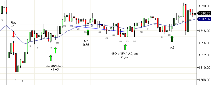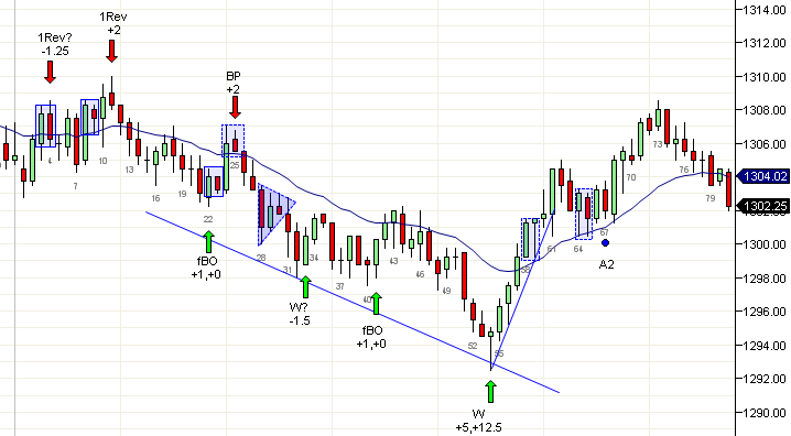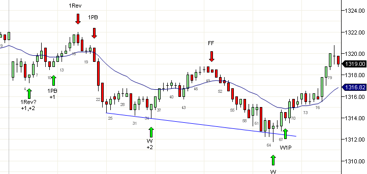 Reversas de cuña y W1P La razón por la que tomo casi siempre las W1P, y las cuñas solo cuando la vela de señal está muy bien formada es simplemente que tengo mucha más información sobre la fuerza y sustentación de la reversa. La publicación de este día cubre las celdas inferior izquierda y superior derecha de las nueve transiciones (publicación del 17 de enero 2011). Por ejemplo, la vela 9 pudo haber sido una posible cuña (ya que no hubo gap entre la última vela de ayer y la vela de apertura de hoy, podemos tratarlo como una continuación). Pero para cuando la posible W1P se presentó en la vela 16, ya teníamos muchas claves de que este intento de reversa podía fallar:
