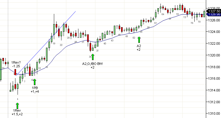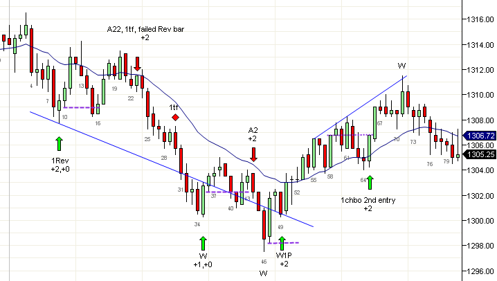 Movimientos de un segmento a la EMA Una señal común del fin de una tendencia y el inicio de una reversa es un movimiento de un segmento a la EMA con cierre más allá de ésta. Hoy el mercado nos mostró varios de estos casos y un trader conservador puede simplemente entrar en la nueva tendencia con la primera retracción. Hoy el primero de estos movimientos fue entre las velas 5 a 7. Si la vela 5 no hubiera rebasado el mínimo de la vela 1 habría sido un movimiento de dos segmentos y por tanto una posible señal de venta. De igual forma el movimiento de las velas 17 a 19 fue de un segmento y aunque no cerró precisamente debajo, una fracción de tick es suficientemente cerca para vender debajo de la la vela 29 de retracción. El solapamiento de la sombra y sobretiro de solo menos de un tick de la línea de canal de tendencia en la vela 35 hizo que esta señal de cuña fuera débil, pero un movimiento de un segmento con velas fuertes de tendencia significa que habrá otro al menos un segmento más hacia arriba, y si la vela 43 no tuviera tanto solapamiento o si la retracción hubiera sido más profunda, habría tomado la operación, en lugar de dejarla pasar. El movimiento de la bandera final en las velas 49 a 52 fue de un segmento y formado por velas bajistas rasuradas. Sin embargo la primera retracción fue la vela inside 57, que forzó una venta en la parte baja y es más riesgosa. Después de un cierre debajo de la EMA, cualquier pequeña vela de tendencia en la dirección del movimiento puede ser usada como vela de señal, especialmente si no tiene sombra. Estrictamente hablando, el movimiento de la vela 64 a la 69 no fue de un segmento, pero para nuestros propósitos, ya que el precio solo rebasó por un tick debajo de las velas previas y generó velas outside alcistas, puedes fácilmente tratarlo como un solo segmento, particularmente en este caso ya que el fuerte sobretiro confirmó la reversa. Cadaver" http://cadavertrading.blogspot.com/ "Las sombras cuentan la historia". Nini