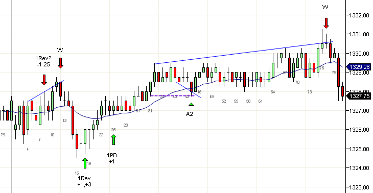 • La vela de entrada era pequeña comparada con velas recientes. • Cerró varios ticks por debajo de la vela de entrada. Unas velas gemelas (bajista/alcista o alcista/bajista) deben ser de tamaño similar y no deben dar entrada alejada de ambas velas, para considerarse una señal. Las gemelas 20 y 21, por ejemplo, fueron una buena señal con gemelas alcista/bajista, pero las 47 es una vela de entrada. La retracción en la vela 49 o la inside 51 pueden ser compradas como W1P. Las W1Ps tienden a desplazarse hasta que el movimiento termina en otra cuña, o hasta la primera retracción en el movimiento hacia abajo a la cuña. Por ejemplo, si la cuña comienza en la vela 3, entonces puedes esperar que la W1P se desplace hasta el máximo de la vela 13. Algunas veces terminan en cuña, como sucedió hoy en la vela 71. Cadaver" http://cadavertrading.blogspot.com/ "Las sombras cuentan la historia". Nini