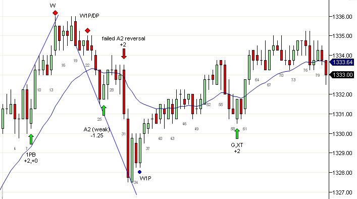 Lunch Money (Dinero del Almuerzo) Durante la sesión del almuerzo (parte media de la sesión americana) las retracciones son frecuentemente complejas y prolongadas. Durante estas sesiones ocasionalmente se dan rompimientos en tendencia, pero son relativamente escasos. La manera más simple de operar en estas horas es mantenerse al margen, y es lo que se recomienda a los principiantes. La hora del 'lunch' está plagada de trampas y rompimientos que aparentan fuerza pero que no llegan a ningún lado, por lo que los operadores de límites son especialmente vulnerables. Pareciera que el mercado toca tus stops al tick para sacarte y luego se da la vuelta. Aún las confiables A2 pueden fallar, como sucedió hoy en la A2 de la vela 34. Esto se debe a que las velas de la hora del almuerzo se forman defectuosamente y las velas de señal no son suficientemente buenas para que muchos operadores entren. Hasta entrar en contra de rompimientos es peligroso, ya que los rompimientos algunas veces tienen éxito especialmente si vienen acompañados de alguna noticia inesperada. Si la sesión matutina tuvo movimiento tendencial, mientras no exista sobretiro, debes asumir que todo el movimiento del 'lunch' es probable que sea una retracción o, en el peor de los casos, un rompimiento en tendencia, y debe al menos ir a probar el extremo previo de la tendencia. La forma correcta de entrar al mercado al final de la hora del 'lunch' es después de un rompimiento con vela de tendencia y entrar en la dirección de la posible falla. Hoy, la relativamente gran vela de tendencia 48 falló y dio una entrada en largo, que puede ser aguantada hasta que el máximo del día (HOD) sea probado o hasta el final del día, con su stop debajo de la vela 52 de entrada. Cadaver" http://cadavertrading.blogspot.com/ "Las sombras cuentan la historia". Nini