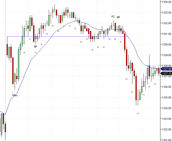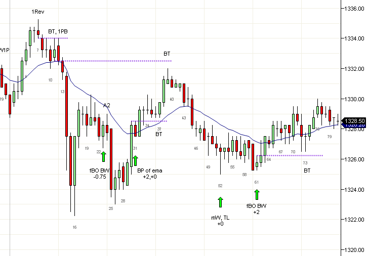 Pruebas de Rompimientos Como Continuaciones de Tendencia Una prueba de rompimiento (BT) es una retracción que llega a un rango de -1 tick a +2 ticks de tu entrada original. En esencia esto significa que los operadores están reafirmando la entrada original y es probable que el precio continúe en la misma dirección. Las BTs son un indicador importante de continuación de la tendencia. Y son una de las raras instancias donde un doji puede ser tratada como una vela de señal válida. Una BT después de una vela de reversa es una forma de operación en primera retracción y puede ser precedente a un gran movimiento. En un día que es esencialmente un gran triángulo como hoy, puedes tener BTs en ambos lados mientras el precio intenta consolidar. Las BTs son de los pocos lugares donde puedes comprar con órdenes de límite, ya que el stop quedará simplemente más allá del punto de giro previo. Sin embargo, los operadores conservadores pueden esperar a que se forme la vela y entrar con orden de stop más allá de la vela de señal. Las BTs no se limitan a velas en puntos de giro. Líneas de tendencia, la EMA (vela 31), y básicamente cualquier barrera que el precio rompa puede servir para generar una prueba de rompimiento. Cadaver" http://cadavertrading.blogspot.com/ "Las sombras cuentan la historia". Nini