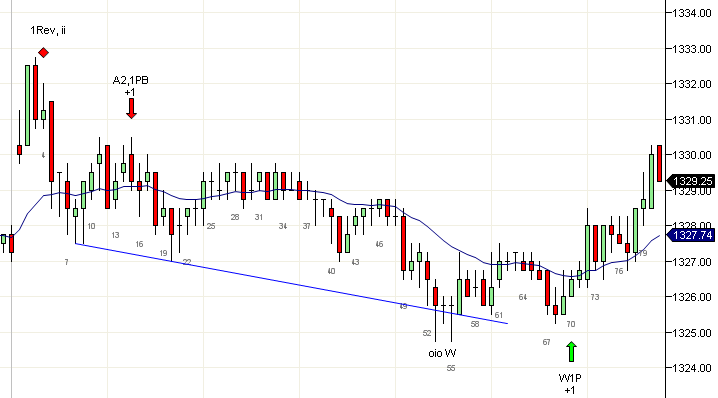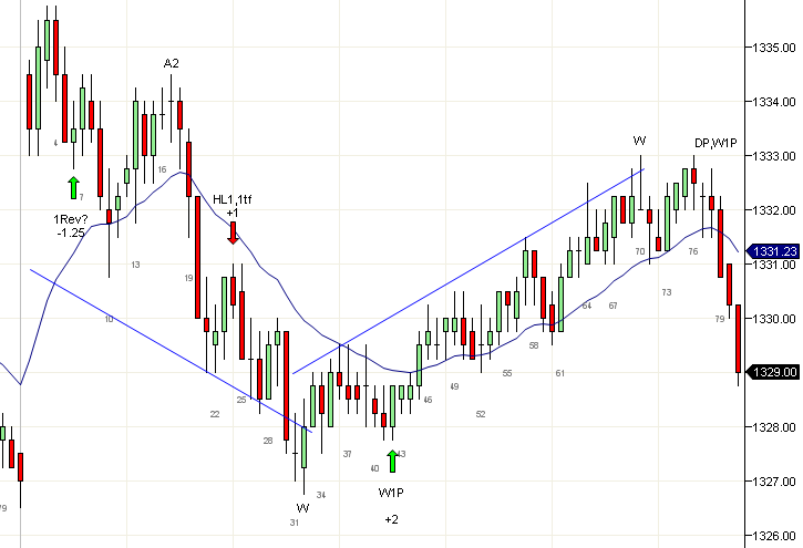 Reversas de Tendencia Lo más probable es que la mayoría de las reversas que verás en intra-día sean reversas de cuña. Frecuentemente hay un sobretiro y una vela de reversa en el tercer empuje, y esto hace que la reversa sea muy clara. Sin embargo, para tendencias alcistas puede no haber ningún sobretiro. Tres empujes alcistas por sí solos no forman una cuña. Necesitas algo más, como un sobretiro de línea de canal de tendencia, vela de reversa o bandera final (FF) como en la vela 47, al final del tercer empuje para calificarlo como una reversa. Los tres empujes deben también ser contados a partir del rompimiento que formó la tendencia, por lo que la vela 5 no cuenta como un empuje. Una vez que se activa la bandera final, puedes buscar entrar en corto. Si prefieres no hacer corto en la FF por parecer un BW (alambre de púas), simplemente debes esperar una entrada en corto A2 como la de la vela 62. El porcentaje de éxito para velas rasuradas o velas de señal de tendencia es alto, y debes preferirlas en lugar de dojis. Por ejemplo, la vela 65 es una doble inside, pero es una L1 y también un doji, por lo que estarás mejor esperando una vela como la 67 que tiene mayores probabilidades. Cadaver" http://cadavertrading.blogspot.com/ "Las sombras cuentan la historia". Nini