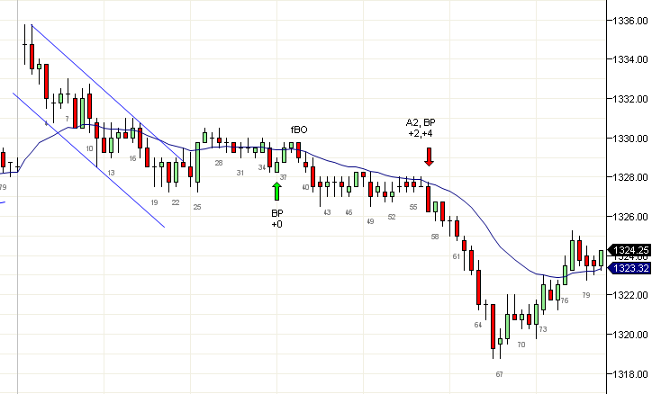 Una tendencia como canal usualmente tiene un segundo segmento similar Cuando hay una tendencia que se mueve prácticamente dentro de un canal, actuará efectivamente como un segmento (y nromalmente lo es en un marco temporal superior). Cuando dicha tendencia rompe existen altas probabilidades que el rompimiento sea simplemente una retracción de la tendencia para después continuar con un segundo segmento de tamaño comparable. La vela 25 rompió la tendencia matutina y dio fin al primer segmento. Una fuerte vela outside alcista en una tendencia bajista es un rango de trading y así es como debes operarlo. Si hay un fuerte rompimiento puedes operar la BP (vela 36) y si falla puedes operar el fBO que te deberá llevar al otro extremo del rango. En este punto puedes tomar un corto de BP. Un segundo intento (vela 57) es en efecto una A2 y por tanto un corto de altas probabilidades. Cadaver" http://cadavertrading.blogspot.com/ "Las sombras cuentan la historia". Nini