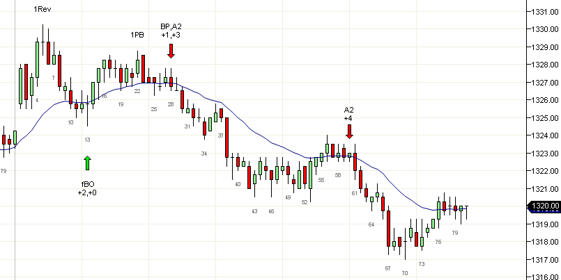 Determinando día de tendencia vs día de rango de trading Se requieren diferentes tipos de trading para operar en días de tendencia y en días de rango., y reconocer pronto el tipo de día es esencial para operarlos exitosamente. En días de rango, éste puede ser pequeño como hoy y es probable que las operaciones de swing sean perdedoras. La manera más sencilla de diferenciar entre ellos es dar un paso atrás y observar la gráfica después de las primeras velas. Si el precio no se ha desplazado una distancia considerable de la vela de apertura, es probable que te encuentres en acción de rango. Si el precio se ha movido 3 o más puntos más allá de la primera vela (aunque después se haya dado la vuelta), es probable que produzca acción de tendencia. En un día de tendencia, puedes tomar una entrada de swing en la primera retracción y aguantarla hasta que la tendencia se termina. También puedes entrar en una A2 o en otros criterios de continuación y la mayoría de los operadores probablemente tendrán éxito con la tendencia. En un día de rango de trading, encontrarás esencialmente una serie de fallas. En ocasiones una tendencia se producirá de un rompimiento de un rango, pero predecir rompimientos es difícil aún para traders experimentados, y la mayoría de los rompimientos fallan (hoy todos los rompimientos fallaron). Cuando el precio intenta romper un rango de trading, puedes entrar con la segunda falla. Esta tiene una buena oportunidad de funcionar si la vela de señal tiene un cierre fuerte como en las velas 8 y 26. Cuando las velas de señal son pobres y solapadas, como la doble inside 52, 53 o la 58, debes operar una posición menor y buscar objetivos menores. Una entrada de fBO debe ser muy fuerte para calificar para un movimiento extendido, y aunque una segunda falla tiende a ir a probar el otro extremo del rango, hay posibilidad de que no llegue tan lejos. La mayoría de tus objetivos deben ser modestos. Si rompe fuerte y entonces produce una retracción, es un posible generador de tendencia, y puedes entrar con la nueva tendencia. En resumen: Los días de tendencia producen giros y continuaciones; los días de rango de trading pueden dar solamente fBOs. Los fBO son operaciones más riesgosas de menos porcentaje de éxito que solo deben tomarse con criterios sólidos buscando objetivos menores. Cadaver" http://cadavertrading.blogspot.com/ "Las sombras cuentan la historia". Nini
