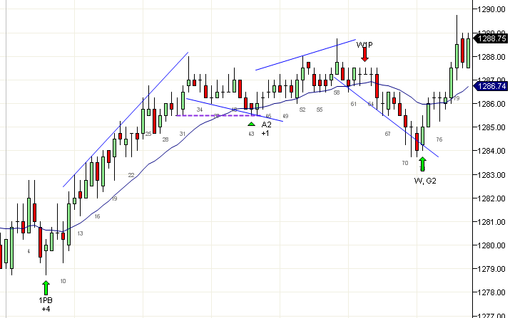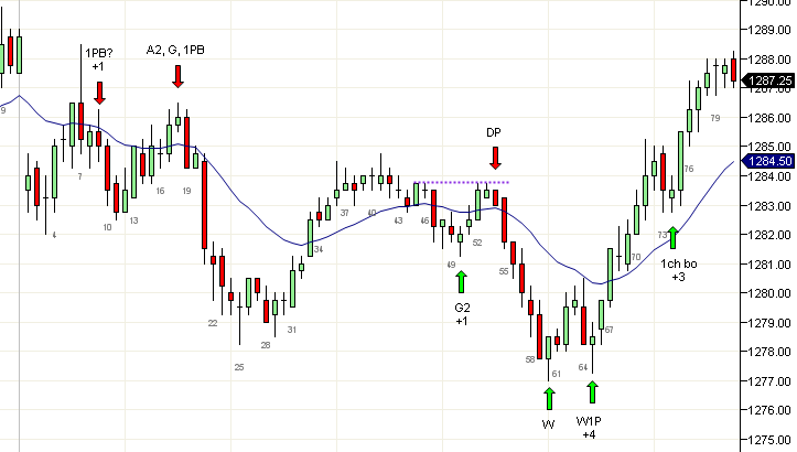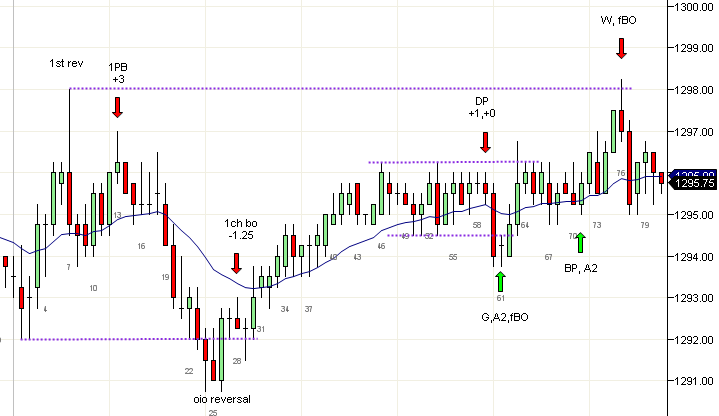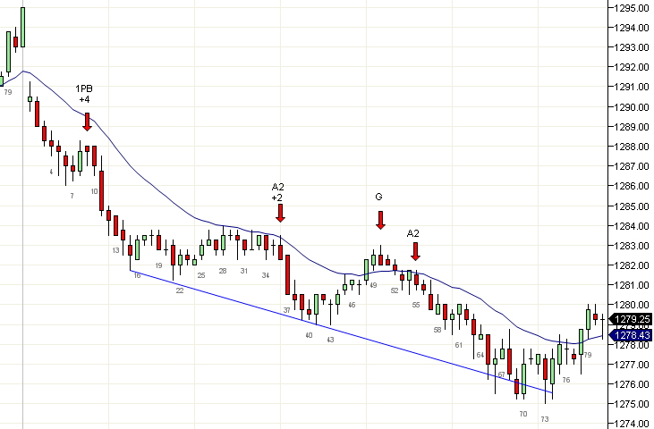 Las mejores operaciones Probablemente hoy hubo cientos de operaciones pero hoy fue un gran muestrario de mis operaciones favoritas. La primera retracción (1PB), retracción de dos segmentos cerca de la EMA (A2), doble tope o doble fondo con retracción (DP), primera retracción después de una cuña (W1P). Los mayores desplazamientos proceden de estas operaciones, y me aseguro entrar en ellos cuando puedo leer las operaciones a tiempo. Hoy perdí las entradas en la DP de la vela 54 y posiblemente la A2 o 1PB en la vela 18. Operando solamente estos 4 criterios de entrada te mantendrá en ganancias aunque el porcentaje de éxito sea sólo del 50% ya que a menudo recorren 4 puntos o más. Cadaver" http://cadavertrading.blogspot.com/ "Las sombras cuentan la historia". Nini