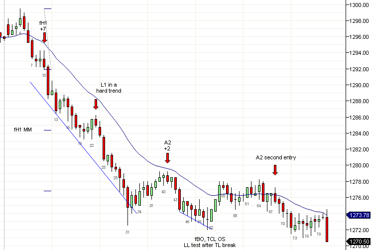 Operando tendencias ‘duras’ Operar una tendencia con movimientos violentos y velas largas es muy difícil ya que obtienes muy pocas entradas y cada entrada se mueve un gran número de puntos. Cuando veas dos o tres velas de tendencia con muy poco solapamiento, ya sabes que se trata de uno de estos días. A menudo la mejor entrada es en la primera retracción, que en el caso de una tendencia ‘dura’ como esta es un tipo especial de H1 fallida (fH1) que comúnmente produce un movimiento proyectado hacia abajo. Entre más brusco sea el movimiento antes de la retracción y entre más débil sea la retracción como hoy, mayores son las probabilidades de alcanzar o exceder el movimiento proyectado. Muchas veces, después que se ha alcanzado el movimiento proyectado se produce un rango ajustado de trading, por lo que me salgo y espero más Acción del Precio. En la mayoría de los días, aguantar una fH1 hasta el fin del día puede ser redituable, como lo fue hoy. Pero ¿qué hacer si perdiste la entrada fH1 en la vela 10, o si te saliste con sólo un par de puntos? Una opción es hacer corto el cierre de cada vela de tendencia o su rompimiento. Yo personalmente encuentro vender en cierres, difícil de digerir, ya que la retracción puede ser tan grande como la misma vela de tendencia, como en la vela 13. Mi técnica es entrar en cualquier retracción y hacer corto debajo de cualquier vela pequeña, independientemente del color hasta que se produzca un sobretiro desagradable, como en la vela 31. Por ejemplo, cortos debajo de las velas 23 y 26 fueron buenas entradas. Operadores agresivos harían corto cualquier H1 esperando que fallara. Una vez que se produce el clímax vendedor, el movimiento de bajada se ha terminado por un rato y debes esperar un retroceso. Este retroceso no necesita aproximarse a la EMA, pero muchas veces probará el máximo de la vela de clímax. Usualmente esto puede operarse por lo menos una vez para ir a probar el mínimo de la vela de clímax. En días como este la mejor política es solo operar en la dirección de la tendencia primaria ya que es posible que se produzca otro gran desplazamiento más tarde en el día, pero muy pobres posibilidades de una fuerte reversa. Por ejemplo, aunque la vela 62 tenía al menos tres razones para ser comprada, yo la dejaría pasar y me enfocaría solamente en las operaciones en corto. Cadaver" http://cadavertrading.blogspot.com/ "Las sombras cuentan la historia". Nini