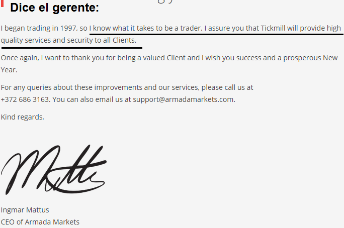 Lo que hay que averiguar si cambio de dueños, ahí cambia todo. Armada va seguir como proveedor de liquides con cuentas grades, yo no creo que va a tirar su prestigio al recomendar Tickmill. Todo puede pasar. El aviso traduce: Yo sé lo que se necesita para ser un trader. Les aseguro que Tickmill proporcionará servicios y seguridad de alta calidad a todos los clientes. Sin estrategia se está dispuesto a intentar cualquier cosa Porter