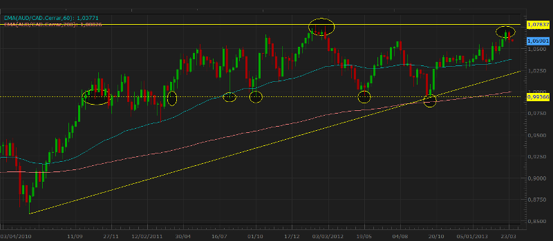 Re: CAMBIO DE TENDENCIAfeliz lunes santo, contraveneno te adjunto grafico semanal del audcad, veo un canal lateral con un soporte muy muy claro y una resistencia mas difuminada, con una buena cuenta y capacidad de poner un stop holgado, ponerse corto ahora mismo no seria descabellado, el top profit estaria en el soporte, creo que seria una posicion para mantenerla abierta seguramente unos meses.