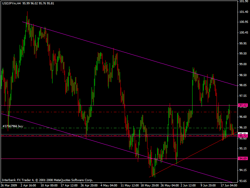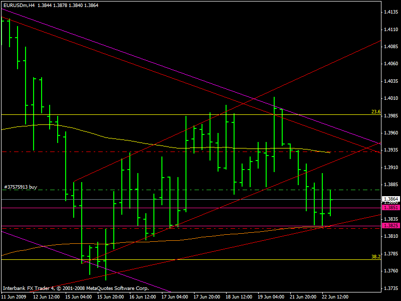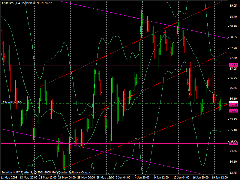 Es dificil por temas de tiempo, ir publicando aqui cada operacion que hago, me refiero, a el momento puntual que compro o vendo una moneda. Cuando sea un pending order, por un tema de soporte en los gráficos de 4 hs, o diarios, será mas facil. Pero en plazos mas cortos, será dificil. adjunto los dos trade en los que estoy en este momento, con un nivel de contratos y de TP (take profit), en el cual, saldaré las perdidas de los trade anteriores. Estoy en un trade en USDJPY, es un buy, ya que está en la base de un canal alcista. El ojetivo, 100 pips. el sl 40 pips. Ahora, de cerrar el trade, bajo el canal, sin necesariamente tocar el SL, lo cierro, tomo la perdida y voy con un sell. En buscar de la base del canal violeta En el grafico del EURO, el razonamiento es similar, pero el punto de cambio el el fuerte soporte en la zona de 1.3825. Mariano