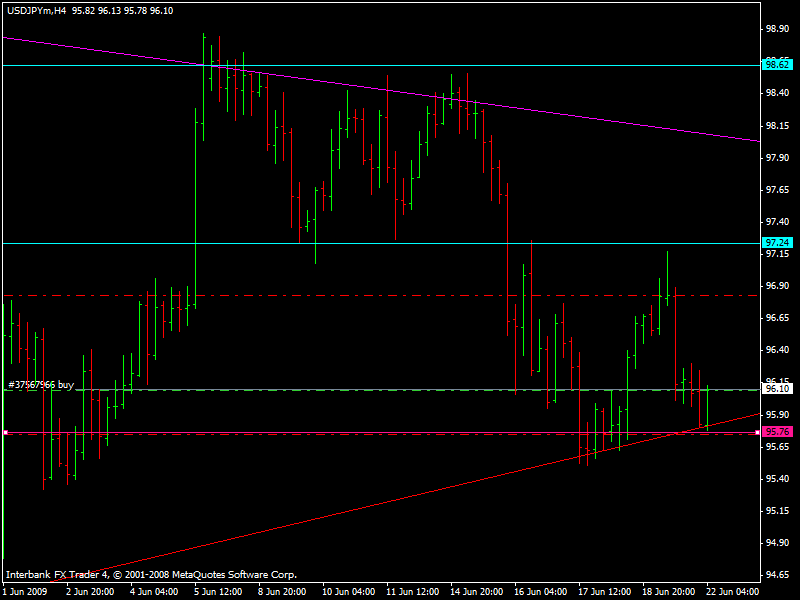 Por ese motivo cierro el sell, y aumentando levemente el nivel de riesgo voy en un buy, por 80 pips. Cierro el sell y abrí un buy en 96,06 Este trade de usdjpy, hasta el momento nos tiene en –24-59 (ya que en este segundo trade, aumente el nivel de riesgo) en resumen ahora estoy en un buy x4 en 96,09, TP 80 pips, y SL 95,75 Salu2 Pd, aqui está el gráfico Mariano