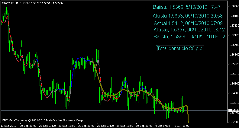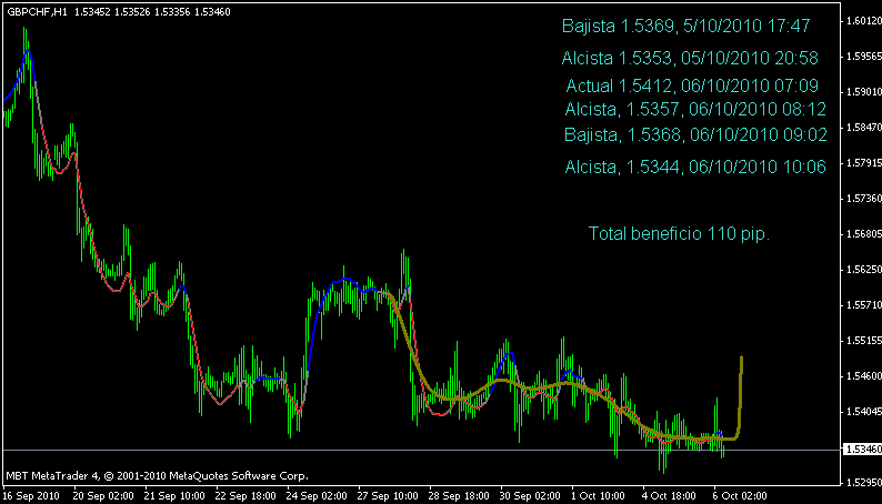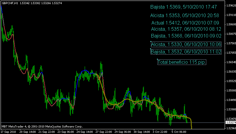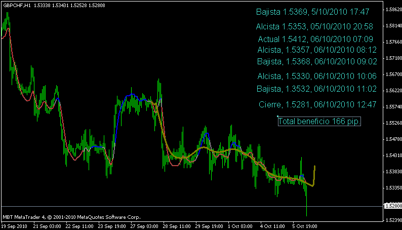 Beneficio 166 pip.Estaba corto siguiendo la última señal y aunque la linea oliva vaciló bastante preferí tomar en consideración la tendencia bajista general y los tramos rojos del indicador.