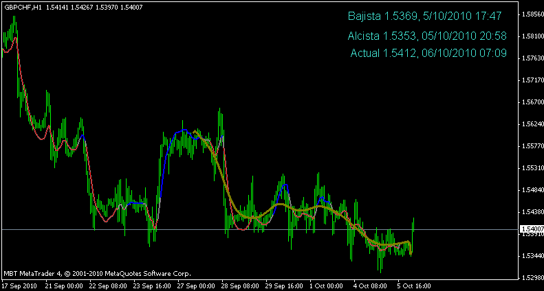 En mi otro hilo subí en ese link subí un indicador para testear y comenzé a hacerlo a mano apuntando en el gráfico los puntos de giro que me daba. En unas doce horas lleva dados 75 pip operando de forma visual. Encima de la imagen está el link para bajar el indicador. Si alguien quiere testearlo lo que nos interesa saber es cuando el indicador dibuja en la parte futura del gráfico cuántas veces acierta y cuántos pips da. En este link parece que se puede testear en Excel: http://www.web-reg.de/hp_addin.html Tenemos ocho variables en el indicador según la línea predictiva verde esté por encima o por debajo de la línea azul o de la roja. La línea verde no siempre dibuja la proyección predictiva en la parte vacía del gráfico. Si alguien quiere construir un sistema con esto le puedo seguir aportando ideas y filtros digitales. Un saludo.