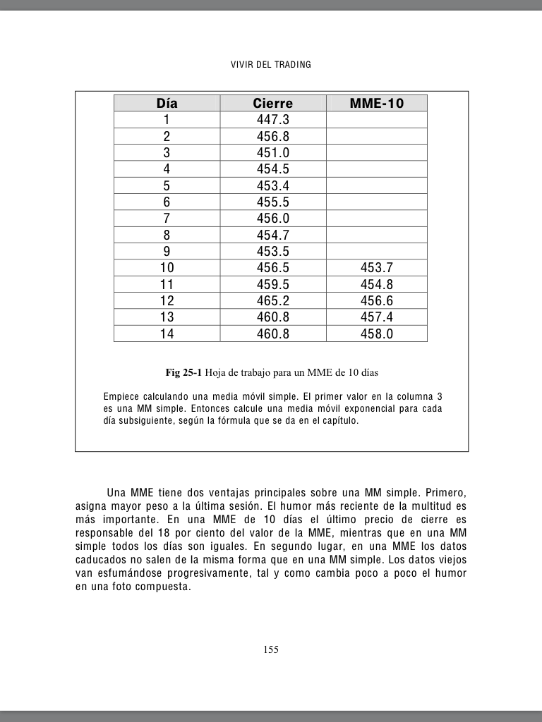 1 447.3 2 456.8 3 451.0 4 454.5 5 453.4 6 455.5 7 456.0 8 454.7 9 453.5 10 456.5 453.7 11 459.5 454.8 12 465.2 456.6 13 460.8 457.4 14 460.8 458.0 instrucciones : empiece calculando una media movil simple . el primer valor en la columna 3 es una MM simple. Entonces calcule una media movil exponencial para cada dia subsiguiente , segun la formula que se da en el capitulo. la formula es MMsimple= precio1+precio2+precioN / N N= numero de dias en la media movil P= es el precio de cierre Formula MMExponencial = Precio hoy X K + MME de ayer X (1-K) K= 2/(N+1) N= numero de dias en la MME *No he podido calcular este ejercicio , mi problema creo esta en que no entiendo como calcular una MMsimple para el primer dia*