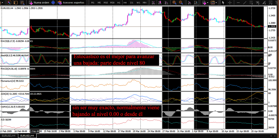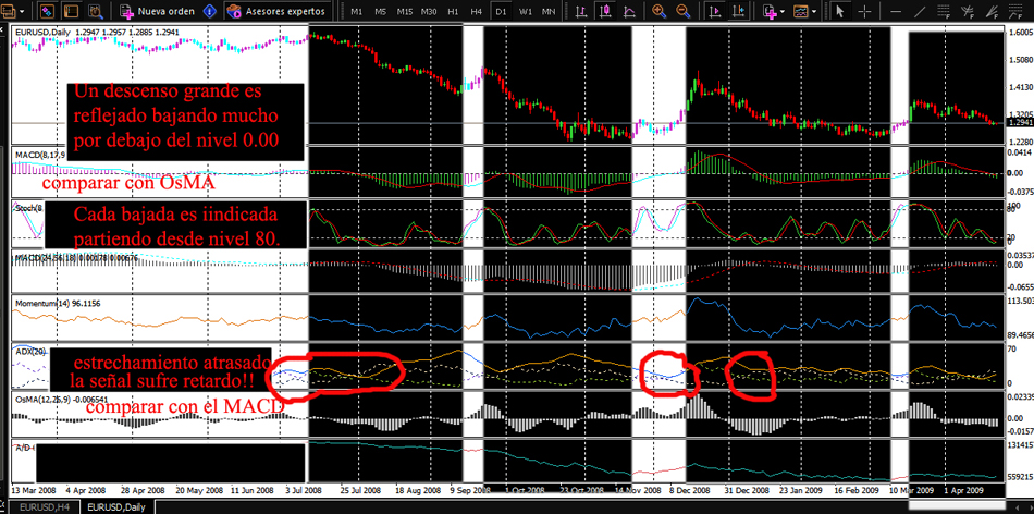 Yo estoy haciendo mis compilacion de notas y estudios sobre este proceloso tema y avanzo algunas cosas para irlo puliendo. La previa aportacion de FXWizard es importante: "Es difícil saber si estamos en una tendencia o no hasta que no estamos metidos en ella. Usar medias móviles de periodo largo (100 ó 200 periodos) y las sucesiones de mínimos crecientes o máximos decrecientes". La ultima frase significa que segun van pasando los dias los precios minimos de las velas diarias son cada vez mas altos, o los maximos mas bajos. Es buenisimo comparar esto con el histograma del indicador MACD, pues avanza un cambio de tendencia fuerte. Si el histograma no sigue el dibujo de las velas (las velas suben y el histograma baja o viceversa), esa falta de sincronismo significa cambio de tendencia en ciernes. Traza lineas de tendencia del ultimo mes, o semana. Poner Soportes y Resistencias, eso no dará referencias de donde puede romperse las fluctuaciones diarias, en temporalidades cortas. Interesante poner las del Pivot Point diario y semanal, sobre todo si coinciden. y las R/S 1 y R/S 2 del Pivot Point diario. Este siguiente trabajito lo he confeccionando leyendo sobre indicadores y apilandolos en un mismo grafico y estudiando que hace cada uno durante los cambios de tendencia. Los resultados mejoran segun usemos una mayor temporalidad, evidentemente. Estos son mis resultados. El ADX da señales muy interesantes cuando el mercado esta a punto de explotar hacia una subida o bajada. Si las líneas confluyen y se han apretado y ahora la verde sube, la roja o punteada baja y todas se abren: señal ALCISTA segura. Si sucede lo mismo pero es la línea roja (o punteada, depende del diseño o configuracion del ADX) la que sube: señal BAJISTA segura. De todas formas el cruce de las líneas verde y roja siempre indica cambio de tendencia. Algunas veces el anterior recorrido de ambas líneas les impiden estar en su posición lógica, al producirse el cambio de manera demasiado brusca para proporcionarlo, por lo que no es raro encontrar la línea verde arriba cuando en realidad el precio esta bajando. La tendencia de fondo nos la da el grafico de mes, semana y día. Las tendencias secundarias o temporales los gráficos de día y horas, y semanas a veces. Comparemos cada una y saquemos la conclusión lógica. El MACD indica SIEMPRE un cambio de tendencia cuando la línea roja cruza el nivel 0.00 o cuando cruza las barras verticales del su indicador. Siempre lo hace por el lado derecho de la grafica. Si lo hace debajo del nivel 0,00 el cambio es ascendente, si lo hace por encima será descendente. El histograma o barras de nivel acompaña. Si viene desde arriba forma una ladera descendente, si venia de abajo, forma una ladera ascendente. La tendencia será ascendente si la línea corta el lado derecho del valle (histograma con barras por debajo de 0.00), y entra por la base de la montaña (barras del histograma por encima de 0.00). Será descendente si saliendo por la ladera derecha de la montaña se hunde en el valle por su horizonte. Si la línea sale de un valle o montaña y en vez de cruzar el nivel 0.00 vuelve a meterse en el siguiente valle o montaña significa breve cambio con vuelta inmediata a la tendencia previa: un falso cambio. Señal escasa pero importante, por eso conviene no fiarse y no hacer apuestas caras creyendo que hemos anticipado una tendencia. Errores asi destruyen muchas horas de beneficios. En el Estocastico solo la línea roja indica el cambio inmediato de tendencia, la azul solo lo adelanta. Para saber cuando un alza se agota y avecina la bajada observar como el OsMA se hunde poco antes, justo o un poquito después de la cresta ascendente del MACD. O sea: de repente se curva en sentido contrario al del movimiento ascendente. Indica caída del interés comprador e inicio del vendedor, aun oculto. Se asegura uno mucho mas si el trend alcista esta tambien señalado por una posicion sobre 30 del RSI y sobre 95 y 96 de Momentum. En trend bajista RSI estará en 70 y el Momentum por ebcima del nivel 100. Esto, aparentemente da mucha ventaja y uno puede pensar: con esto todo esta hecho!!!. Con tu moral llena de entusiasmo y tus señales tan claras y convincentes es facil decidir ponerse manos a la obra y enriquecerse con Forex... Pero cuidado!. Aqui vemos las cosas a toro pasado. Coge plataforma, instala los indicadores en el grafico de 1D o 4H y con una hoja tapa la pantalla. Ahora comienza a mover el papel hacia tu derecha, descubriendo la grafica, muy poco a poco, como si el mercado se estuviera moviendo justo en este momento... y trata de predecir que sucederá en los siguientes momentos!. La cosa cambia, eh!!! ja ja ja Cuando todo parecia indicar que bajaba... no sucedió hasta un buen rato después!, cuando creias que subia... bajaba!, el ADX qu eparecia abrirse como una rosa mañanera, prometiendo un trend maravilloso... se amustia como delicada flor, marchitada prematuramente por un sol abrasador dirigido por Fibonacci celestial... ¿Qué poeticamente frustrante, no?. ja ja ja Asi es la vida del trader!. Una putadita tras otra, hasta la victoria final!. ![]() Bueno, pues eso es exactamente lo que sucederá cuando operes: entonces no tendrás la parte derecha del grafico para decir: "eso es precisamente lo que yo habia predicho que sucedería!". Tendrás que poner una orden y esperar a que el mercado te de la razón... o te la quite. (la mención de colores es relativa, pues depende de como este configurado o diseñado el indicador, que a veces cambia al ser usados con distintos parametros). Aviso Legal: Lo que a mi me ha funcionado no necesariamente le funcionara a usted. No debe invertir dinero que no pueda permitirse perder. Lo acabará perdiendo, de hecho.