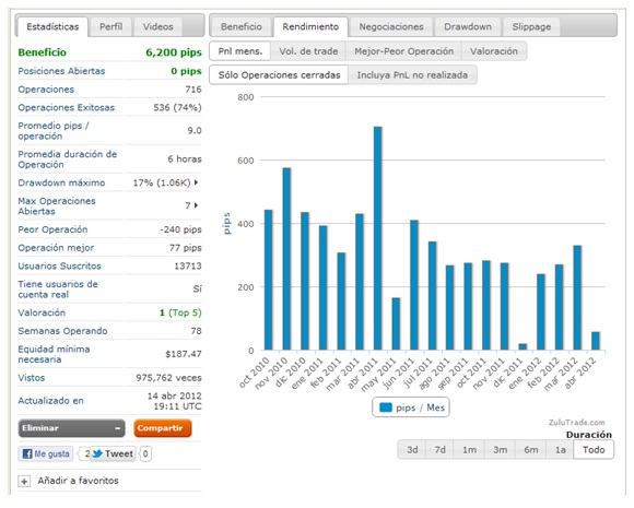 Re: Cómo empezar en FOREX con ZULUTRADEUna pregunta Juan, ¿ Una estrategia que a final de Més, pierde bastantes PIPS, pero gana más de un 25% en MONEY, tiene futúro en Zulutrade?,