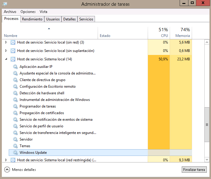 En esta versión del Windows Server 2012, no se pueden detener las actualizaciones automáticas. Cosa que en las primeras versiones si se podía. Eso no es bueno, porque he visto que el sistema arranca el Windows Update y come mucha CPU, en mi caso un 50%. Lo que hago es ir deteniendo ese proceso, pero se arranca de nuevo. Os pongo una foto!