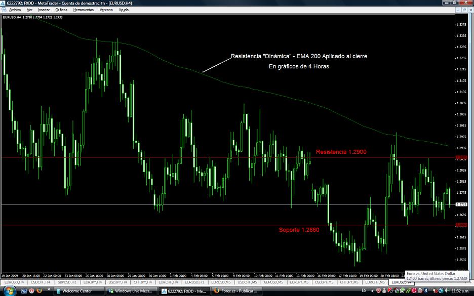 A alguno de ustedes alguna vez no le pasó que le recomendaron muchísimo una película creándoles muy altas expectativas y al momento de verla resultó que sí era muy buena pero que debido a tanta publicidad y tanto que le hablaron al respecto ya no les impactó demasiado y de alguna manera esperaban tal vez un poco mas??... Pues parece ser que algo así está ocurriendo con las noticias económicas de Estados Unidos ya que no deja de sorprenderme como las noticias económicas se contraponen a la realidad de los precios en el par EUR/USD, me explico: Parece ser que las noticias económicas para EEUU ya llegan gastadas, es decir que todo el mundo está tan a la espera de dichas noticias que cuando estas llegan pues ya no causan el impacto que deberían causar. Por ejemplo las noticias para el día de hoy ya cesaron y debo resaltar que lo hicieron de una forma horrorosa, sin embargo el dólar no parece haber mostrado signos de debilitamiento al respecto... imaginen cómo estaría el dólar si las noticias fuesen muy buenas... madre mía, sálvese quien pueda. Esto me hace llegar a una conclusión algo evidente: Económicamente hablando para la recuperación del Euro debemos dejar los malos augurios para el Dólar y comenzar a ver resultados de un avance del Euro por sí solo. Y es aquí dónde el euro falla ya que ante un agonizante dólar el Eurno no parece dar indicios de "salud". Dejando de lado el parloteo vayamos al grano: Es verdad que aún no se quebraron ni el soporte de 1.2660 ni la resistencia de 1.2900 y el precio continua oscilando con falta de decisión en este rango. Sin embargo debo admitir que dicho precio se encuentra más cerca de quebrar los 1.2660 llegando a "coquetear" incluso con los 1.2680, mi opinión? pues la misma continuar vigilando estos dos puntos. Como complemento puedo sugerir emplear un EMA 200 en el par EUR/USD (Valga la redundancia) en gráfico de 4 horas que funciona perfectamente como Soporte o Resistencia Dinámicos, en este caso el EMA 200 es una fuerte resistencia que va coincidienco con los 1.2900. Para que puedan observarlo mejor adjunto el gráfico de 4 horas. Saludos