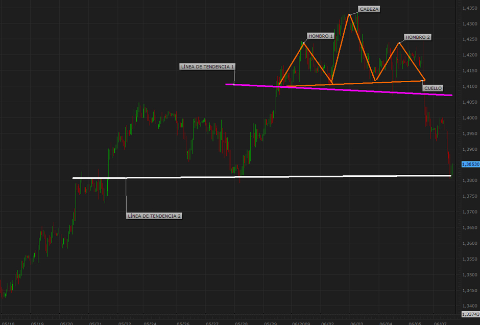 Re: ¿CUAL ES LA LÍNEA TENDENCIA EN ESTE CASO?Lo que apunta FX Wizard es correcto en todo caso lo que estas buscando ahí es la línea de cuello, y deberá estar a partir de la unión de la cabeza (el pico central) con los hombros, (los pequeños picos de cada lado de la cabeza) por cierto viendo tu gráfico me parece que lo que tienes es que la linea de cuello se rompió y luego hizo un pullback. De hecho fue la señal que operamos de venta en el el euro el viernes durante el programa de punto nueve y que puedes ver (si te chutas toda la grabación que dura como 3 horas, explicado más claramente en la grabación que subí de mi clinica de las 10:30 en video, es decir durante todo mi programa de punto nueve verás la imagen de protección y a partir de la clínica como a la 3ra hora ya verás mis gráficos y precisamente la explicación y seguimiento que hicimos de ese trade para cerrarlo). Si gustas revisarlo está en www.7pasos.com/analisis.php