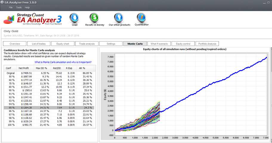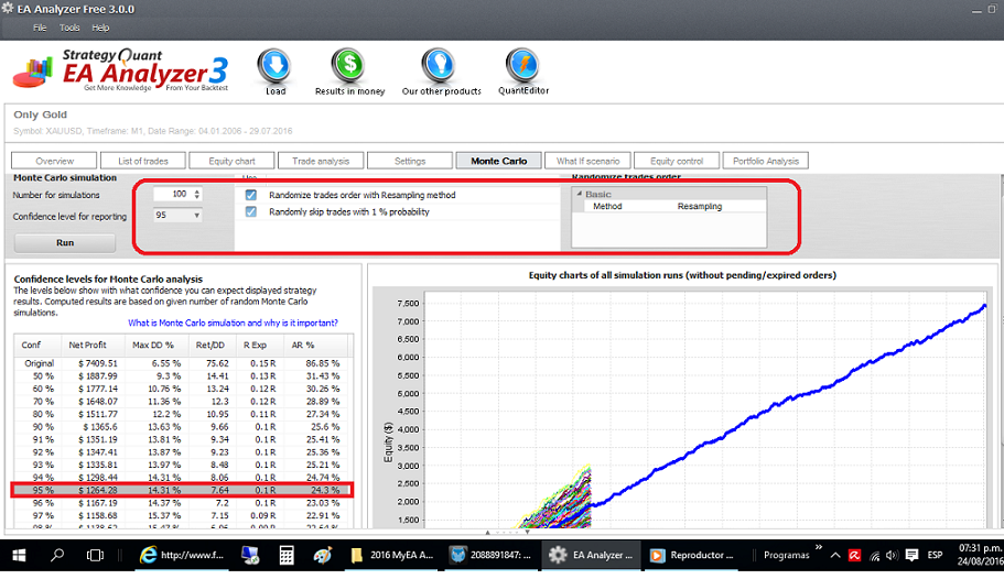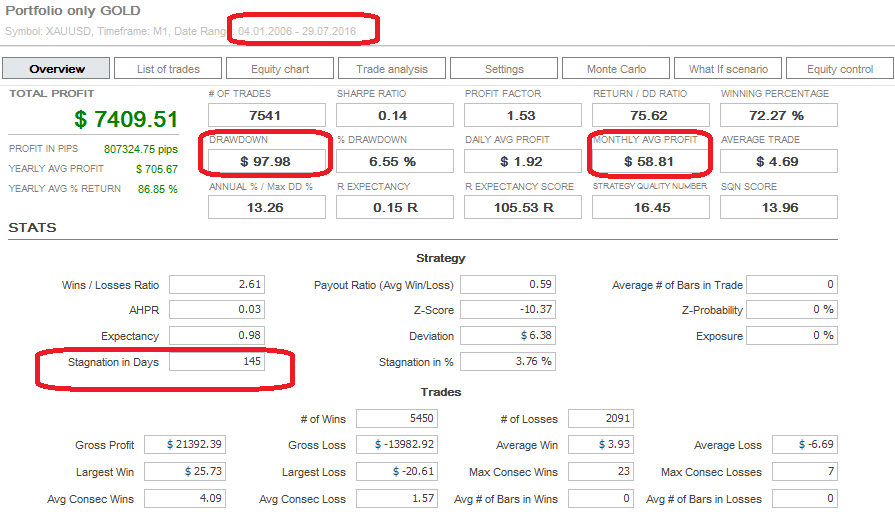 Convertir el “Monthly performance” a porcentaje es tan simple como dividirlo por el capital inicial de la prueba (el que uno desee como inversor), de media de los 12 años se ve en el estudio que está en 6.996,54 (Montly average profit) para el capital inicial que uno desee. Pero hay que tener en cuenta el riesgo, para ello una buena forma de medirlo es a través del ratio de sharpe simplificado y de la volatilidad, además del estudio de DD y flotantes negativos.