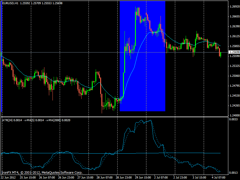 Bueno esto sería cuestion de estudiarlo. Puede que solo dejaramos de contemplar la posibilidad de operar si el indicador fuera decreciente y por debajo de nuestra linea de referencia, y estar preparados cuando el indicaror es creciente y esta proxima a la referencia. En las fotos de abajo he puesto una EMA 3 del ATR(24) para suavizar la linea. Luego a esta linea le he puesto una EMA 7 como linea de señal. No se si esto puede servir para algo, espero que si. Saludos. Las cajas azules indicarian la zona donde no operar.