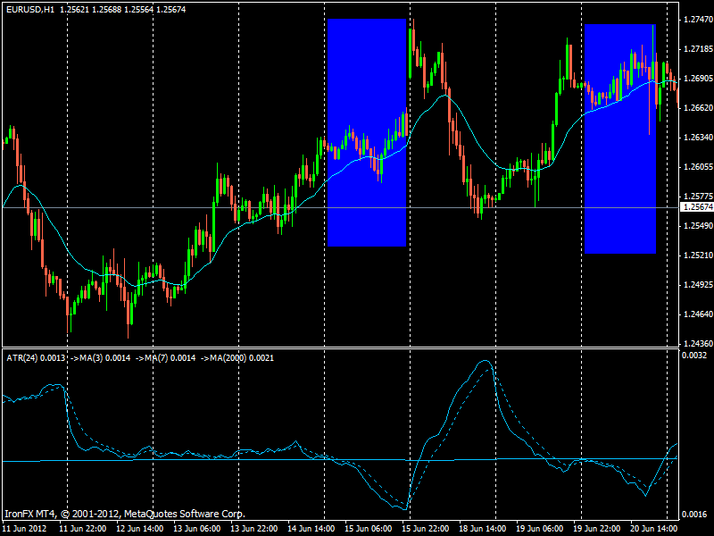 Buenos días amigos: Creo que es la primera vez que escribo, aunque os he leído bastante. Lo que planteo en el titulo del asunto creo que no es una cuestión baladí. En esta situacion de mercados planos siempre pierdo dinero. No hace falta darse cuenta que el mercado esta plano, pero las grandes subidas vienen despues de un mercado plano y en esos momentos entro al trapo y me suelo quedar colgado. No se si teneis algún criterio para no operar cuando las condiciones son como las de ahora (si teneis algun criterio para operar ganando pues espero me lo digais  ) Por si se quiere usar un criterio objetivo basta con mirar la ema 20 mezclada entre los precios para tenerlo. Pero como he dicho no se si se deberia usar algun otro criterio que evite entrar al trapo de pequeños movimientos engañosos. He estado cabilando y se me ha ocurrido usar el ATR(24) en velas de una hora, es decir lo que que me dice el indicador es el ATR de 24 velas de una hora. Luego he puesto una SMA 2000 sobre lo anterior (unos tres meses) para considerar si la volatilidad está alta o baja. Observando puedo ver que los peridos de volatiladad baja no es conveniente operar y los de volatilidad alta coincide con movimiento de mercado aprovechables. No se si esto es correcto o si hay metodos mejores para esto. Agraceceré comentarios que me ayuden y nos ayuden a todos con este importante asunto (al menos para mi). Gracias de antemano.