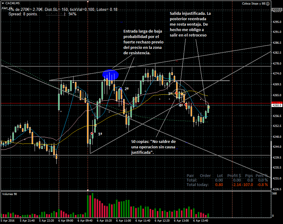 Sesion lenta y corrosiva. Primera entrada mala pero de muy poca perdida. La segunda era de baja probabilidad y lo sabía pero quise entrar por que no tuve suficiente paciencia. Entrada larga donde poco mas arriba habia una fuerte resistencia y donde tres velas antes habia habido fuerte rechazo del precio. Tercera entrada corta despues de la rotura de un minimo relativo. Entrada razonablemente buena pero me salí. Ello provoco una posterior entrada algo tardía para poder soportar un retroceso. Hubo retroceso en la cuarta entrada y salida en BE. A ver mañana como se dá. Saludos.
