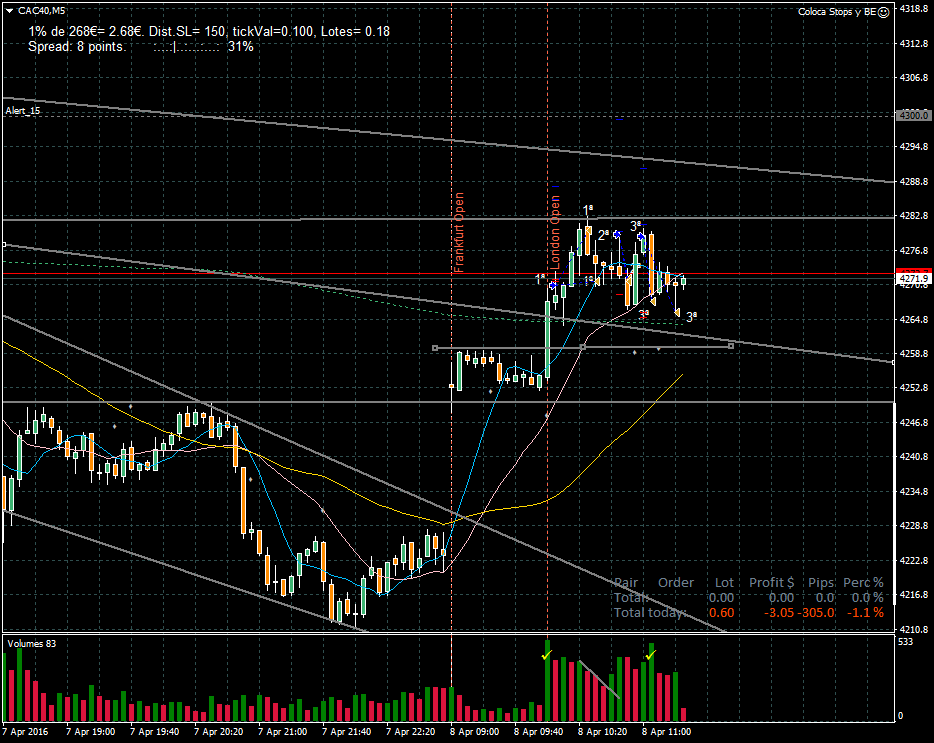 Hoy he empezado mal, pero afortunadamente he terminado con +1.2% La primera mala. El error, considerar un retroceso algo que no lo era. El precio entonces retrocede de verdad casi un 60% y como no quiero que las perdidas se me conviertan en grandes perdidas cierro con un -1.1%. Luego, la segunda entrada, una potente envolvente y la tercera encima del maximo. La tercera que era de alta probabilidad y poco recorrido la utilizo para compensar gran parte de la perdida inicial, es decir, cierro con +0,8%. Luego abrí una 4ª pero me di cuenta de que estaba arriesgando sin necesidad y la cerré enseguida con +0.1%. Ya tenia casi compensada la perdida. Me di cuenta que la primera posición tenía que haber cerrado un parcial cuando el precio estaba alto, así que en cuanto el precio volvió a alcanzar la zona alta del canal cerre un parcial y casi inmediatamente otro. Como he dicho al final he quedado con +1.2% y satisfecho en cuanto a que parece que el correctivo de ayer ha dado frutos y no he sentido apenas cumpulsión para cerrar posiciones antes de tiempo sin causa justificada. Un saludo a todos amigos. ![]()