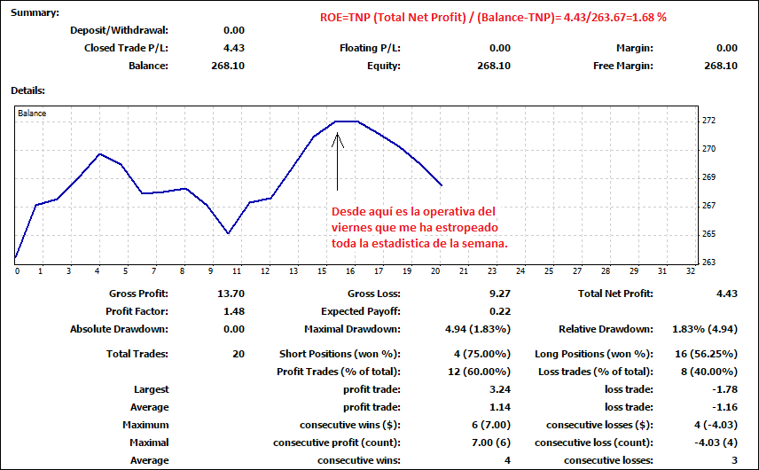 Rentabilidad de la semana: 1,68% Profit Factor: 1,48 Maximo Drawdown: 1,83% Nº perdidas consecutivas 3 La tasa de aciertos: 60%. Baja para lo que aspiro. Total operaciones 20 Mejorando el PF y la tasa de aciertos podria subir el riesgo. En esta semana me he movido con un riesgo maximo del 1% por operacion que luego siempre es menos. La rentabiliad con este riesgo a mi juicio es muy baja, estudiaré la posibilidad de subir el riesgo mirando las estadisticas de esta semana. Saludos