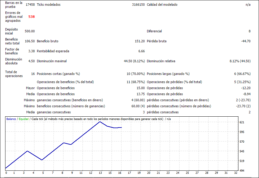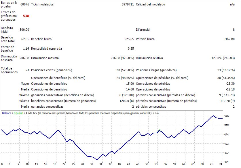 -La calidad del modelado... aunque digas que te da igual porque lo haces solo para sacar conclusiones... con una calidad n/a no puedes sacar ninguna conclusión... minimo minimo, deberías de hacer el backtest con calidad 90% para poder tener resultados un poquitin mas convincentes, y esto solo si lo haces para "jugar" si quieres hacer algo serio, si o si debes pasar por 99%, mas aun si el EA va a por pocos pips, hay una guía hecha por mi en la sección de estrategias. - Luego el tiempo de backtest, mínimo te recomiendo que hagas de 4 años, si pasa esa prueba luego los 4 anteriores y luego los otros 4 anteriores, así 12 años, pero bueno esto cuando la cosa esta avanzada, para hacer pruebas con un backtest de 4 años vas bien sobrado y no se tarda tampoco demasiado una ves que sabes como hacerlo. - Bueno esto, margen a parte del tema de programación, aplicar martingala a un sistema con ratio 1:10 es un suicidio en toda regla... ya de por si un sistema 1:10 es un suicidio, si le sumas martingala... por una perdida (que tarde o temprano llega) deberás multiplicar por 11 el lotaje original para recuperar solo la perdida y obtener una unidad, seria 0,01- pierde- 0,11... pierde - 1,21... como vuelvas a perder la próxima progresión son 13,31 lotes... Si quisieras seguir investigando con martingalas el ratio mínimo te recomiendo que sea 1:1 y de ahi para arriba, por ejemplo con un raio 3:1 (risk/reward) puedes permitirte un factor multiplicador de 1,5... asi la progresión podría ser 0,01 - 0,01 - 0,02 - 0,03 - 0,05 - 0,08.... mucho mas llevadero y podemos marcarnos un limite de perdida. Un saludo! “No sirve para nada proclamar la verdad en economía o recomendar cosas útiles. Es la mejor manera de hacerse enemigos” A. Kostolany