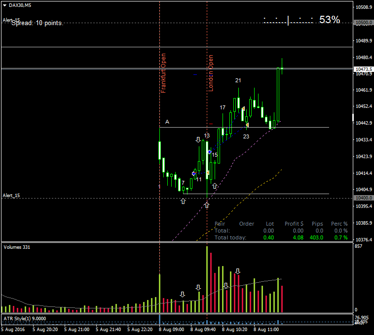 Hoy la operativa creo que ha sido interesante. Haré una descripción detallada da la opertiva de hoy, pero antes comentaré globalmente lo que ha pasado. Una primera entrada larga antes de la apertura de Londres, bien encaminada, pero en cuanto se abrió Londres dehacieron el camino andado y se me cerró la operación en BE. Después, entrada en m1 y cierres interesantes pero con un pequeño error de bulto que explicaré. La vela 6 nos dice que no hay oferta. La vela 7 es una NR con un volumen casi el doble de la vela 6. Esperamos a la vela 9 que es una buena vela de señal y entramos largos por encima de su maximo. La vela 11 se posiciona mucha oferta y la vela 12 es un poco tramposa por que no le acompaña volumen. Al cierre de la vela 11, al menos tendría que haber tomado parciales. Apertura de Londres y fuerte vela bajista pero con demanda subyacente y posible spring. Entro largo con gatillo en M1. Vela 15 buena vela de señal, pero yo ya estaba dentro. Vela 16 gran vela con buen volumen y cierre en maximos muy cerca de la línea de resistencia A. Vela 17 posible upthrust por lo que ajusto mi SL. Vela 18 IB. Ajusto mi SL debajo de la 17. BO por encima de la línea A con buen cierre y buen volumen. La siguiente vela acompaña. Ya pensaba que el precio llegaría al objetivo en la siguiente resistencia, pero no. Vela 21, reversion. Cierro parcial. Vela 22, muy peligrosa cerrando debajo de la vela 20. Aquí cometí un fallo al colocar mi stop debajo de la vela 20 en vez de debajo del eje A. Podría haber cerrado con algo mas de ganancias. Pero la perfección es dificil de conseguir, aunque vamos tras ella. Saludos.